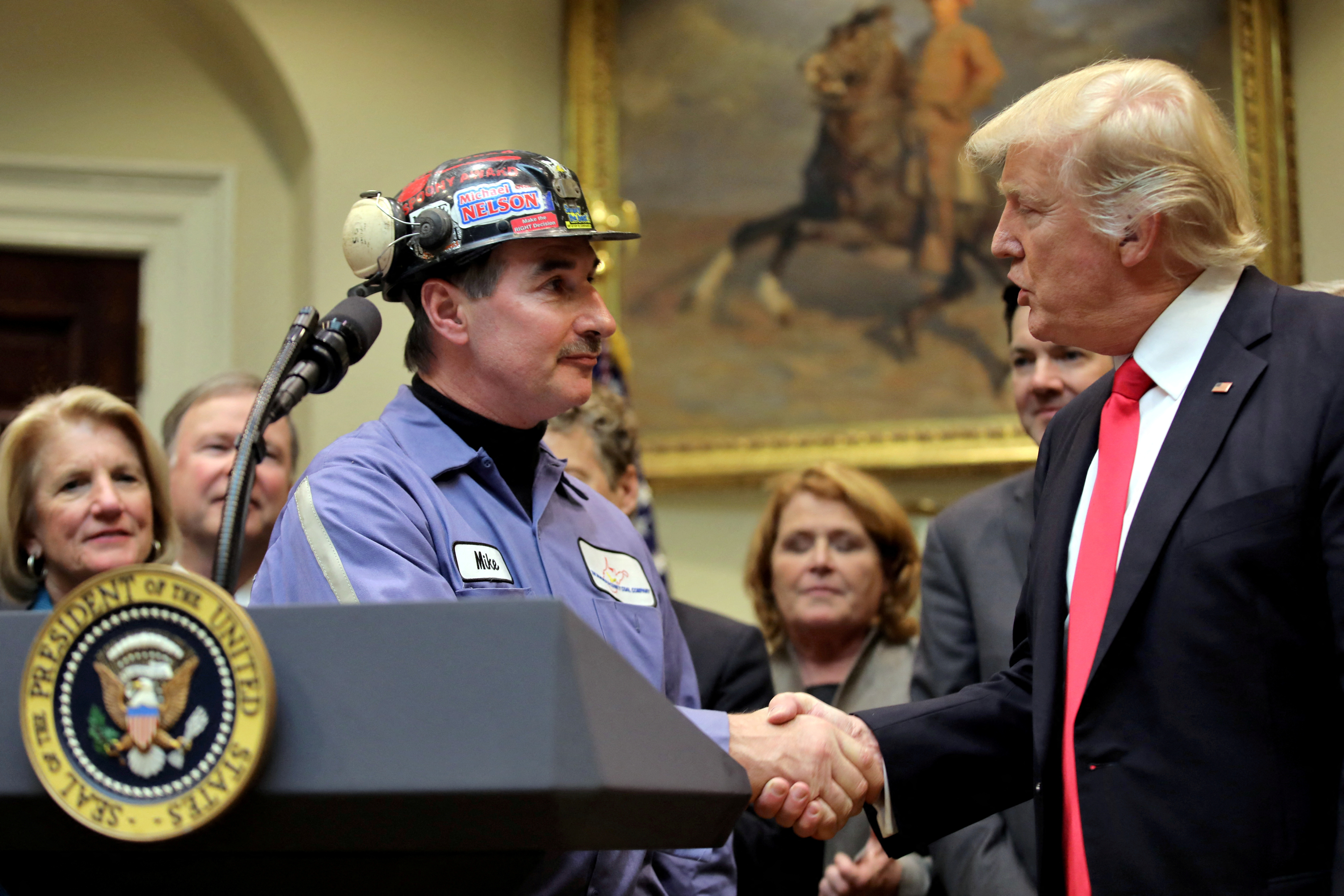 邁克爾·尼爾森,一名煤礦工人,與時任美國總統唐納德·特朗普握手,特朗普準備在2017年2月16日於華盛頓白宮簽署第38號決議,廢除“溪流保護規則”。路透社/卡洛斯·巴里亞/檔案照片9月5日(路透社) - 總統候選人唐納德·特朗普提出了一項以最大化美國燃料和電力產出為中心的能源政策平台,部分內容是拆解拜登政府應對氣候變化的核心努力。這位共和黨前總統的競選團隊表示