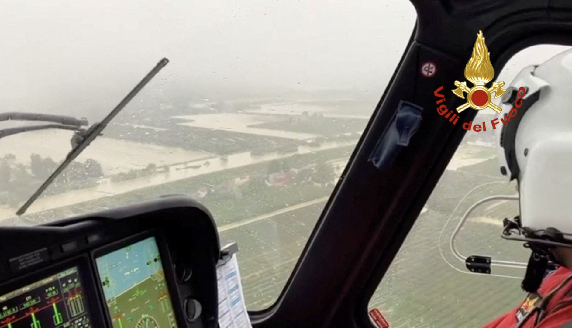 第1項,共2項 一名消防員駕駛直升機飛越巴尼卡瓦洛的洪水氾濫區,因惡劣天氣引發意大利艾米利亞-羅馬涅大區拉文納的洪水,2024年9月19日。維吉利·德爾·福科/通過路透社提供