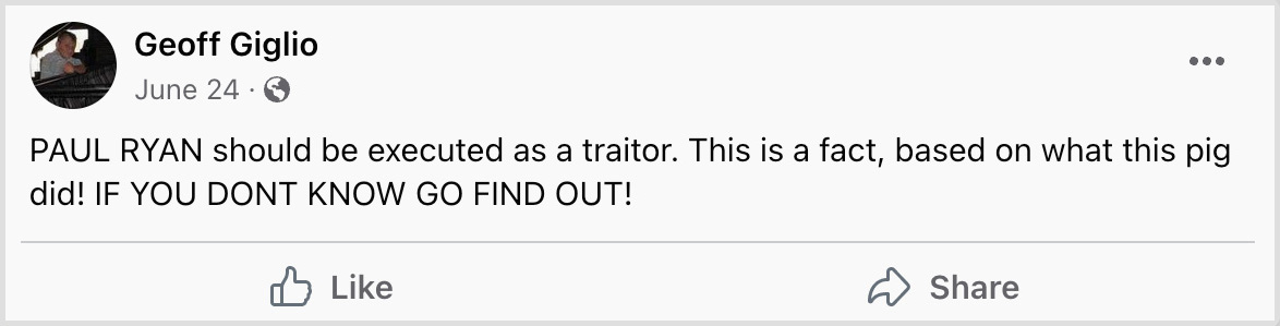 吉利奧針對前美國眾議院共和黨議長保羅·瑞安的威脅性Facebook帖子,特朗普經常將其視為不夠忠誠。## “你會被逮捕的”