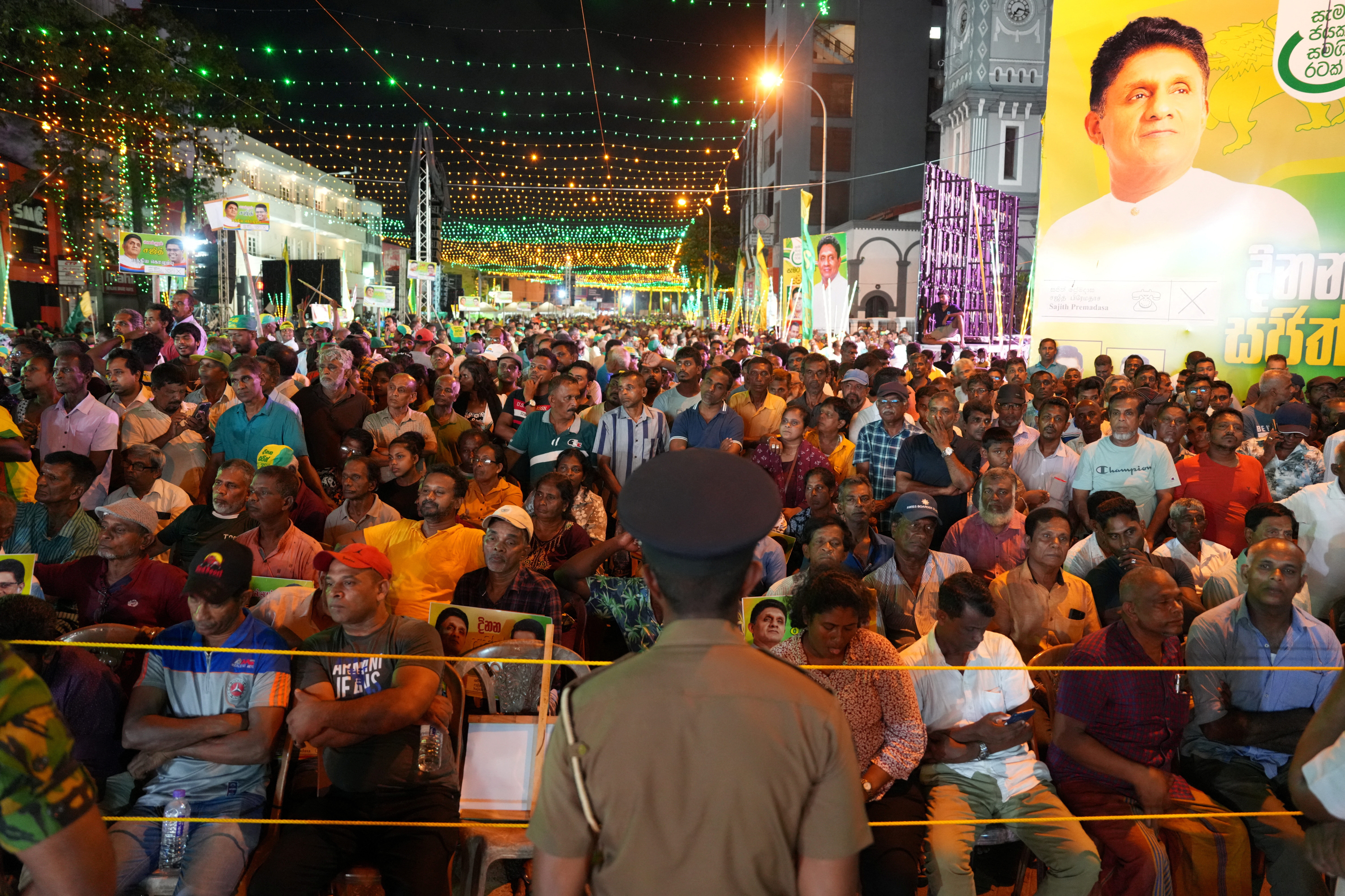 第1項,共2項 一名警察在斯里蘭卡科倫坡為薩吉特·普雷馬達薩(Sajith Premadasa)領導的薩馬吉·賈納·巴拉維加(SJB)黨舉行的選舉競選集會上站崗,選舉在即,時間為2024年9月18日。路透社/蒂利納·卡盧託塔吉