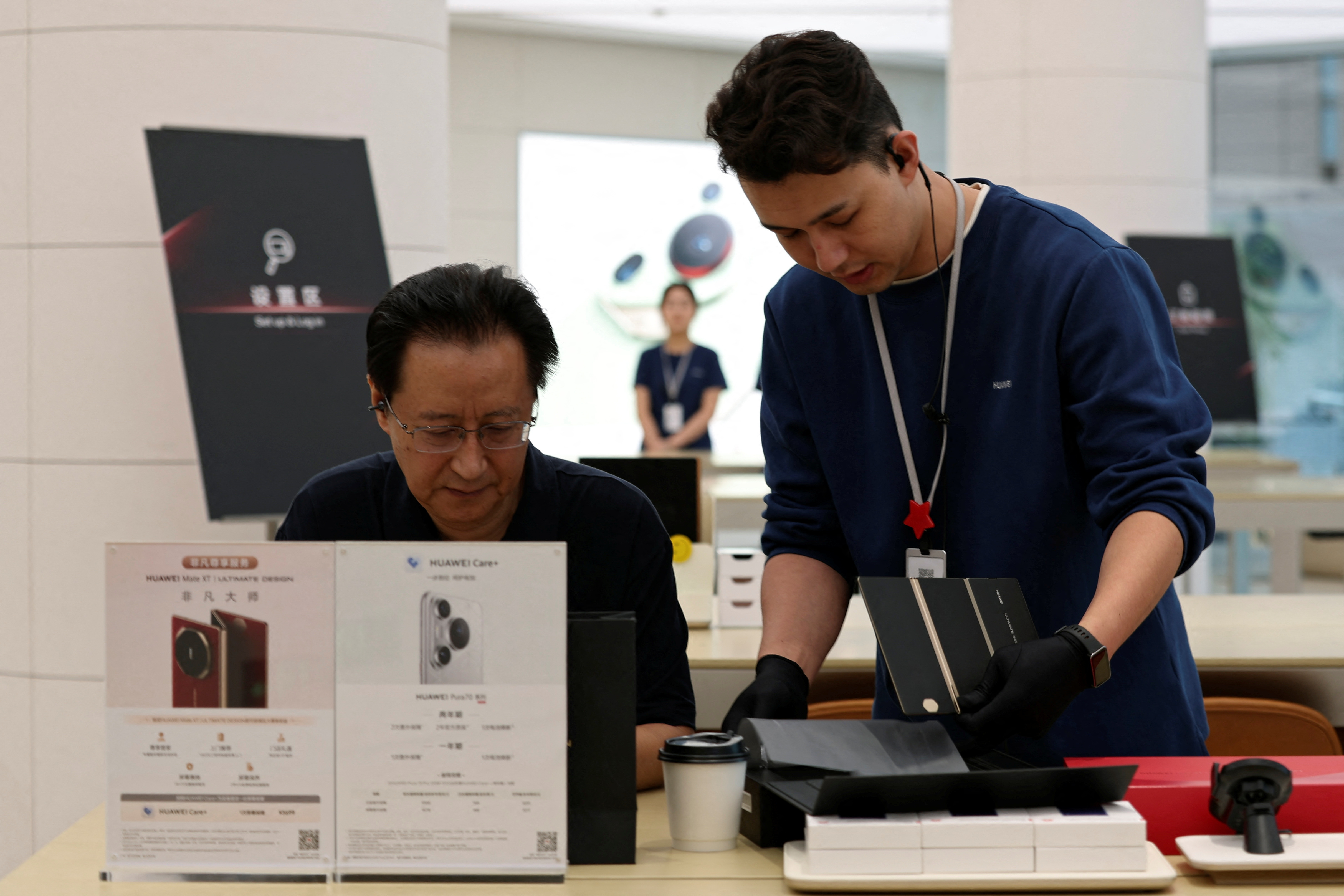 第1項,共5項 一名工作人員介紹華為Mate XT,這款三摺疊智能手機於2024年9月20日在中國北京的華為旗艦店開售。路透社/弗洛倫斯·羅