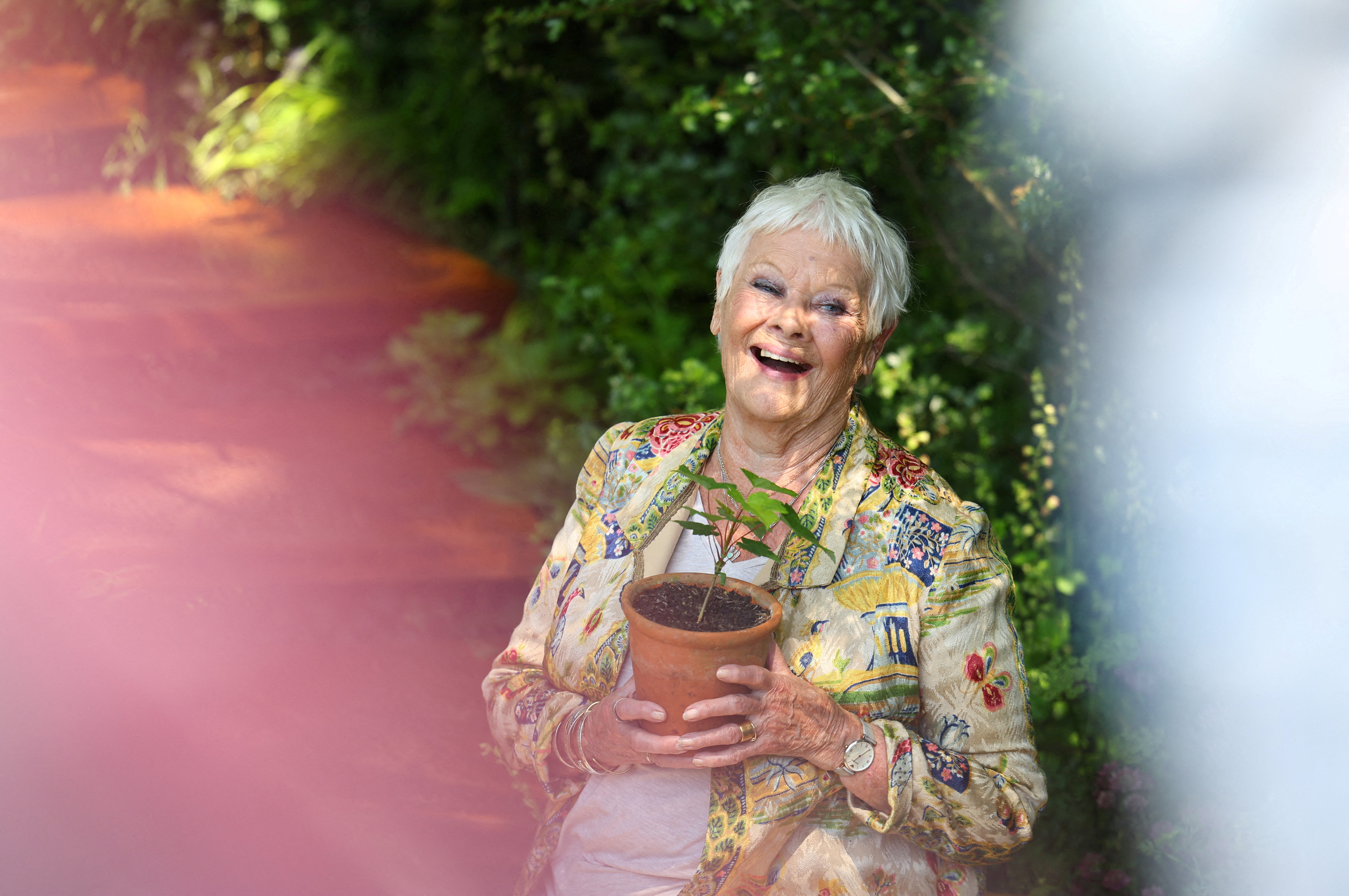 三張中的第一張,英國女演員朱迪·丹奇與在諾森伯蘭的哈德良長城被破壞者砍伐的西卡莫爾間隙樹的幼苗合影,地點在2024年5月20日的倫敦切爾西花展。路透社/託比·梅爾維爾/檔案照片