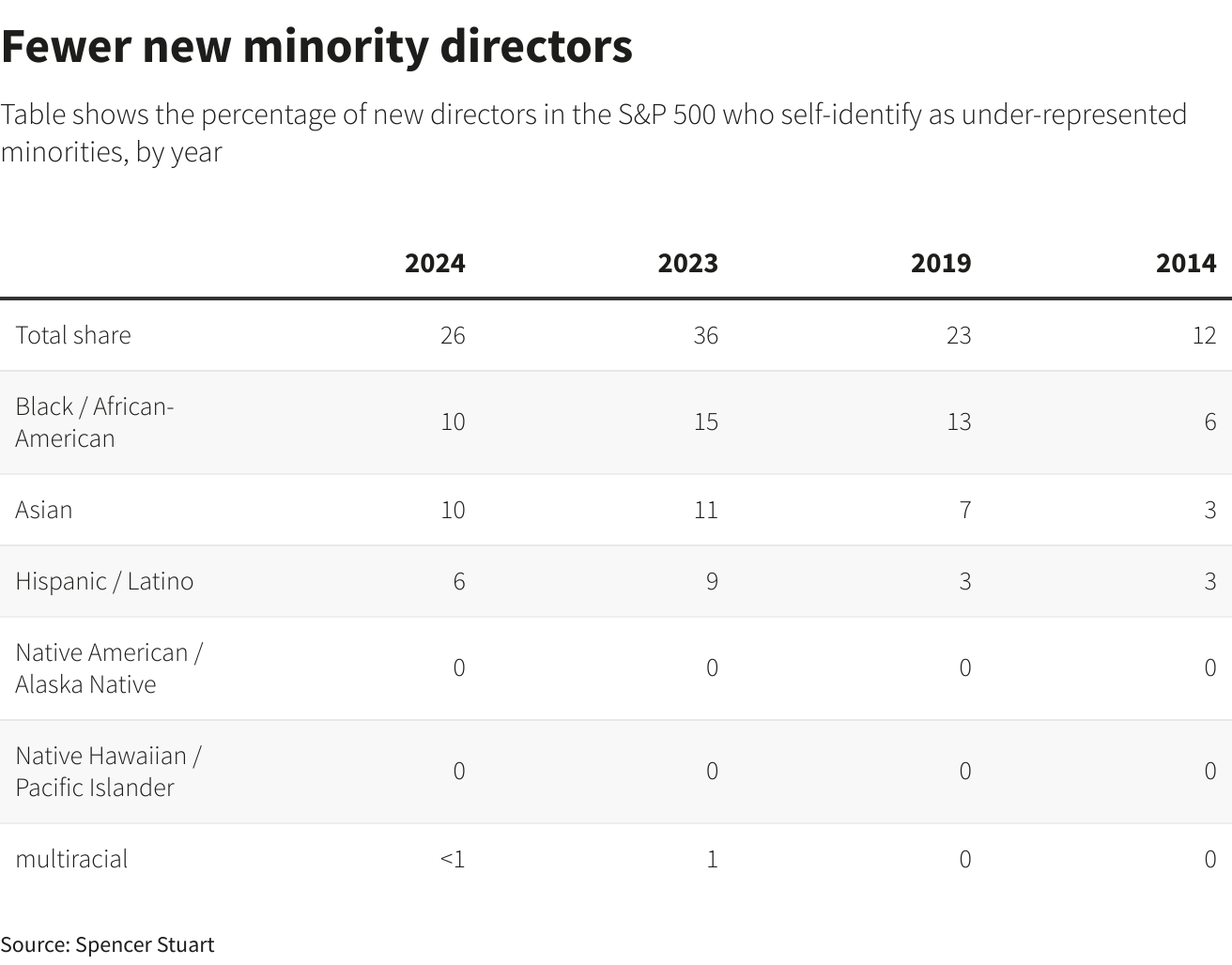 美國 人口普查局估計黑人或非裔美國人占人口的14%,而20%是西班牙裔或拉丁裔。黑人佔標準普爾500指數董事會席位的11%,而西班牙裔僅佔5%截至去年。此外,女性僅佔標準普爾500指數董事會席位的33%。這不會很快改變。女性佔2024年新任S&P 500董事中有42%,低於2023年和2022年的46%。自我認定的新少數族裔董事的比例降至26%,斯賓塞·斯圖爾特表示,2021年為47%。斯賓塞·斯圖爾特的實踐負責人朱莉·道姆表示,減少的情況可能表明董事會在達到目標,因為每年每個S&P 500董事會開放的新席位不到一個,即使他們仍然致力於多樣性。