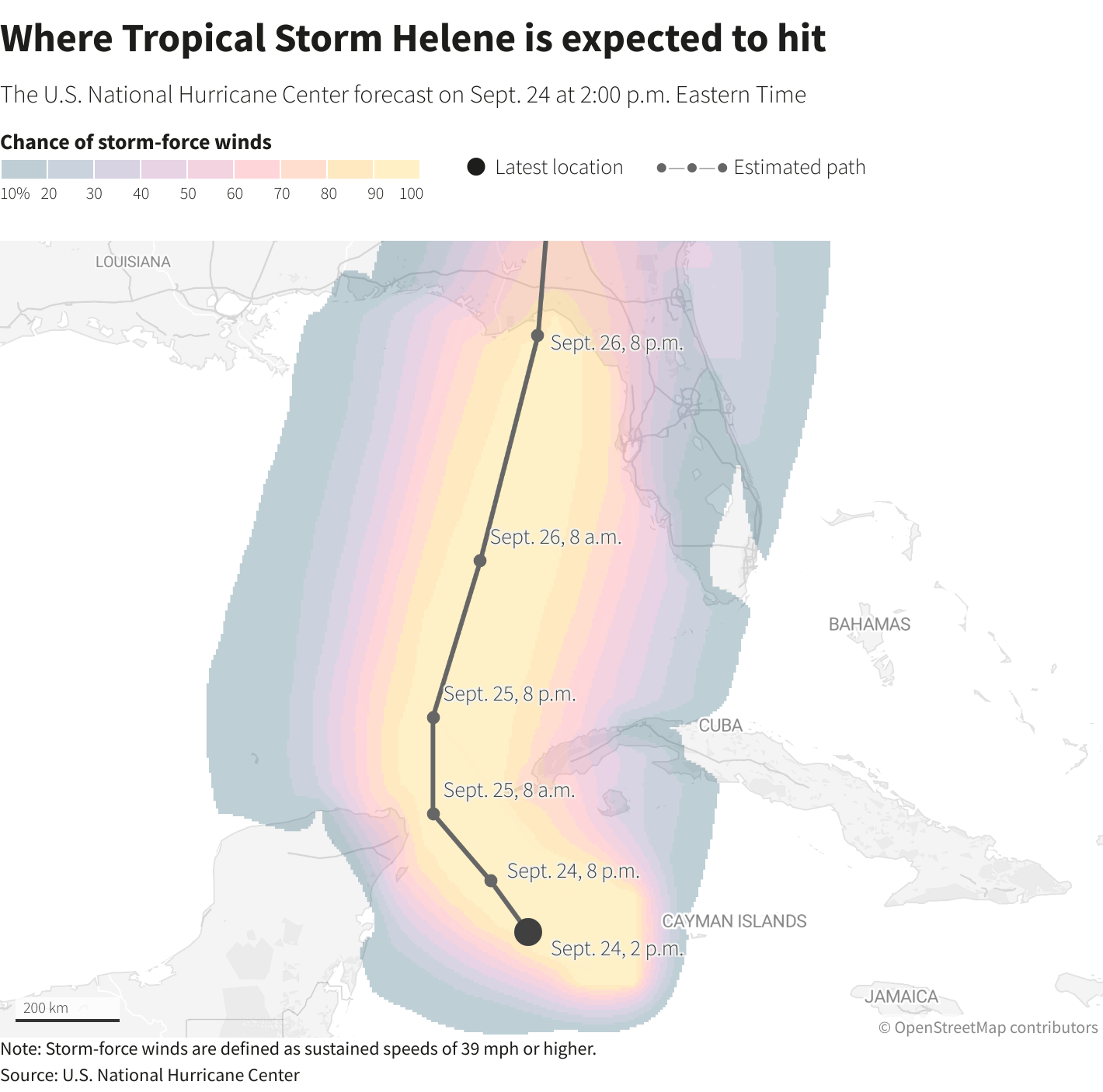 9月26日(路透社)- 佛羅里達州為颶風海倫的到來做好準備,預計該颶風將在週四襲擊該州的潘漢德爾地區時成為強大的4級風暴。