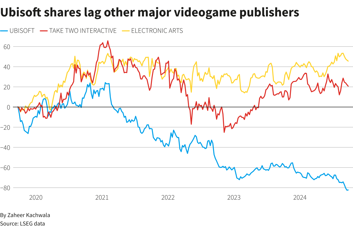 育碧的股票表現不及其他大型電子遊戲出版商,原因是對其遊戲的支出較弱。