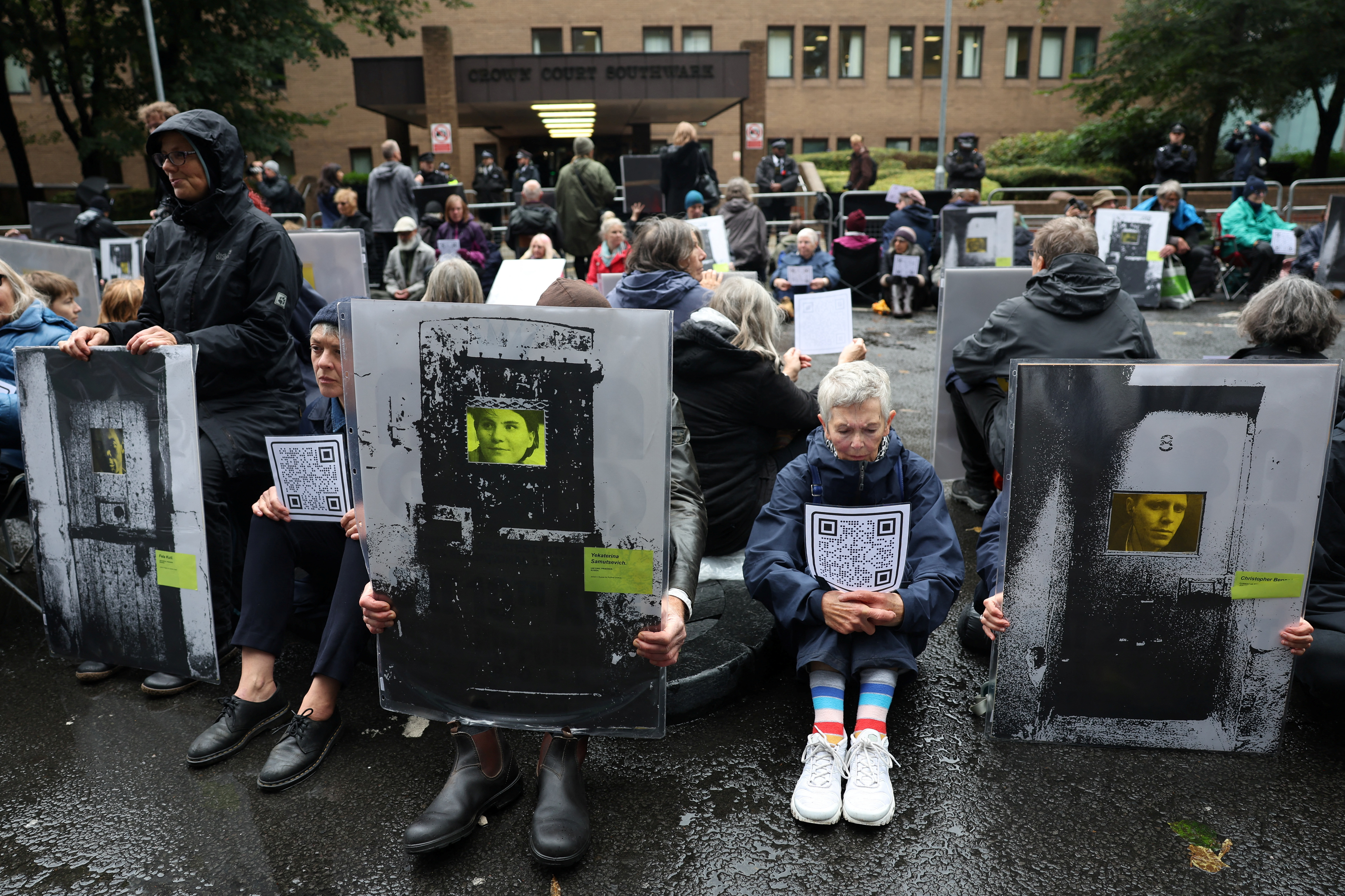 第1項,共5項 抗議者在南華克皇家法院外舉着標語,紀念安娜·霍蘭和菲比·普拉默的判刑日,她們因在2022年向倫敦國家美術館的文森特·梵高《向日葵》畫作投擲亨氏番茄湯罐而被判定為刑事損壞罪,地點:英國倫敦,2024年9月27日。路透社/伊莎貝爾·因凡特斯