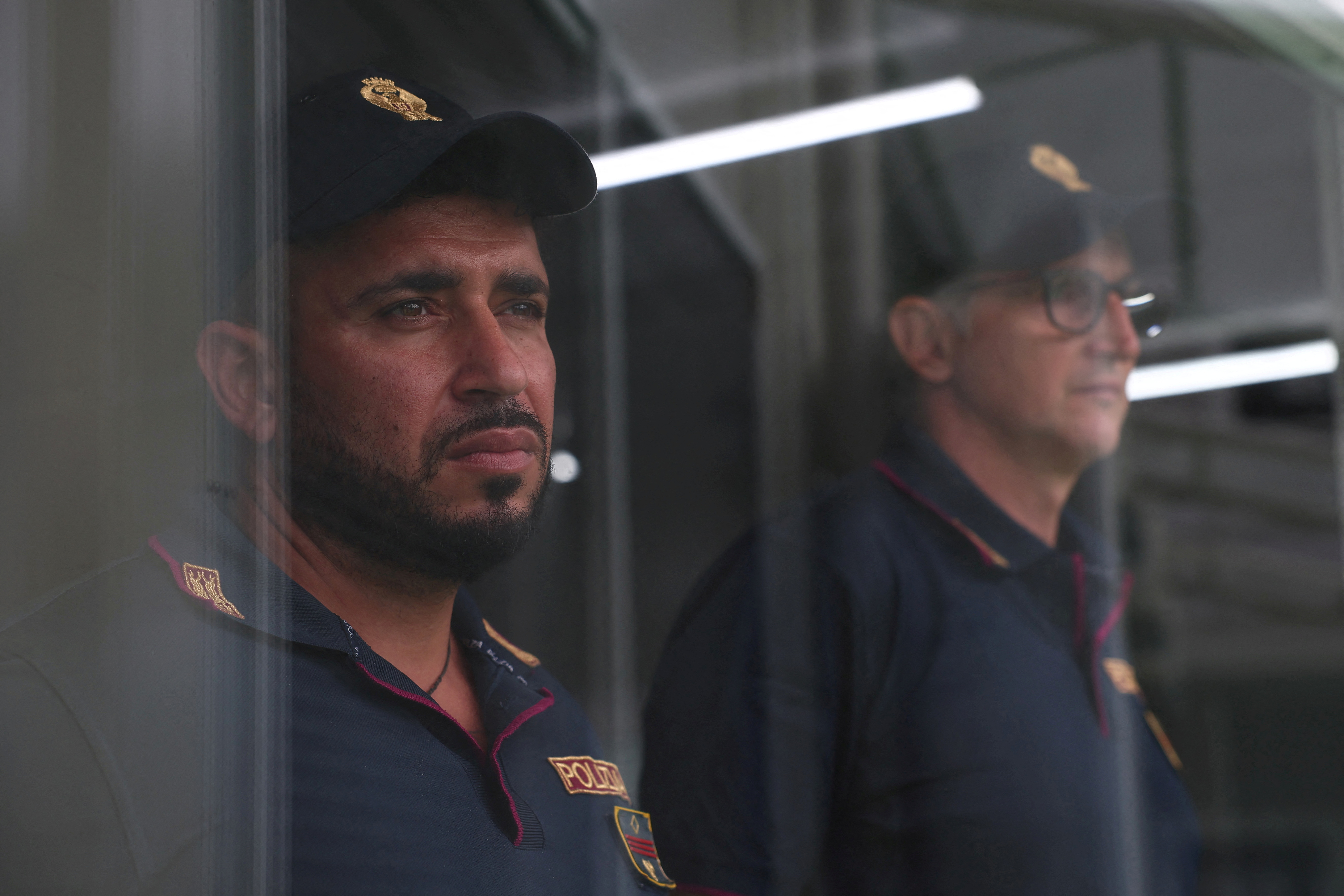 意大利警方的兩名警官在阿爾巴尼亞聖金港口的接待營地內,意大利將在此處理非法移民,2024年10月11日。路透社/弗洛里昂·戈加/檔案照片