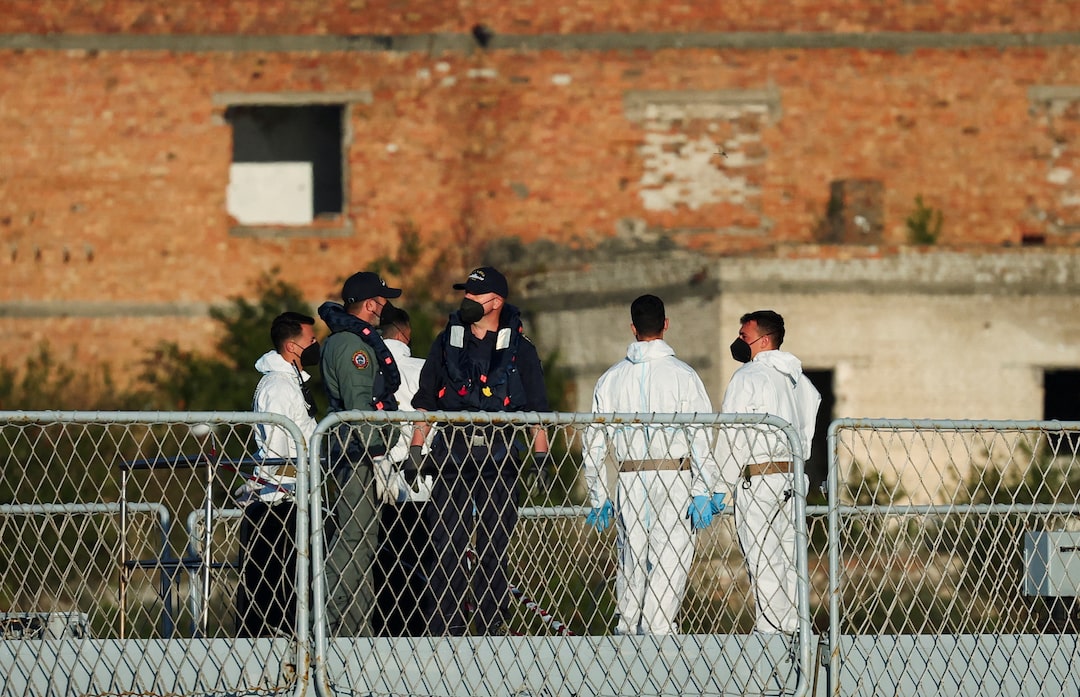 移民和安全官員在意大利海軍艦艇Libra下船時走過歐盟旗幟和意大利國旗,該艦艇作為與意大利達成的協議的一部分抵達阿爾巴尼亞,處理在意大利水域附近被捕獲的數千名尋求庇護者,地點在阿爾巴尼亞的申金。路透社/弗洛里昂·戈加 “這些移民為了到達歐洲而進行了漫長而危險的旅程,現在正重新前往阿爾巴尼亞,以便他們能夠回到自己的祖國……對我們來説(歐洲作為)一個民主、價值觀和人權的地方正在結束,”阿爾巴尼亞人權活動家阿里爾達·萊萊希説。