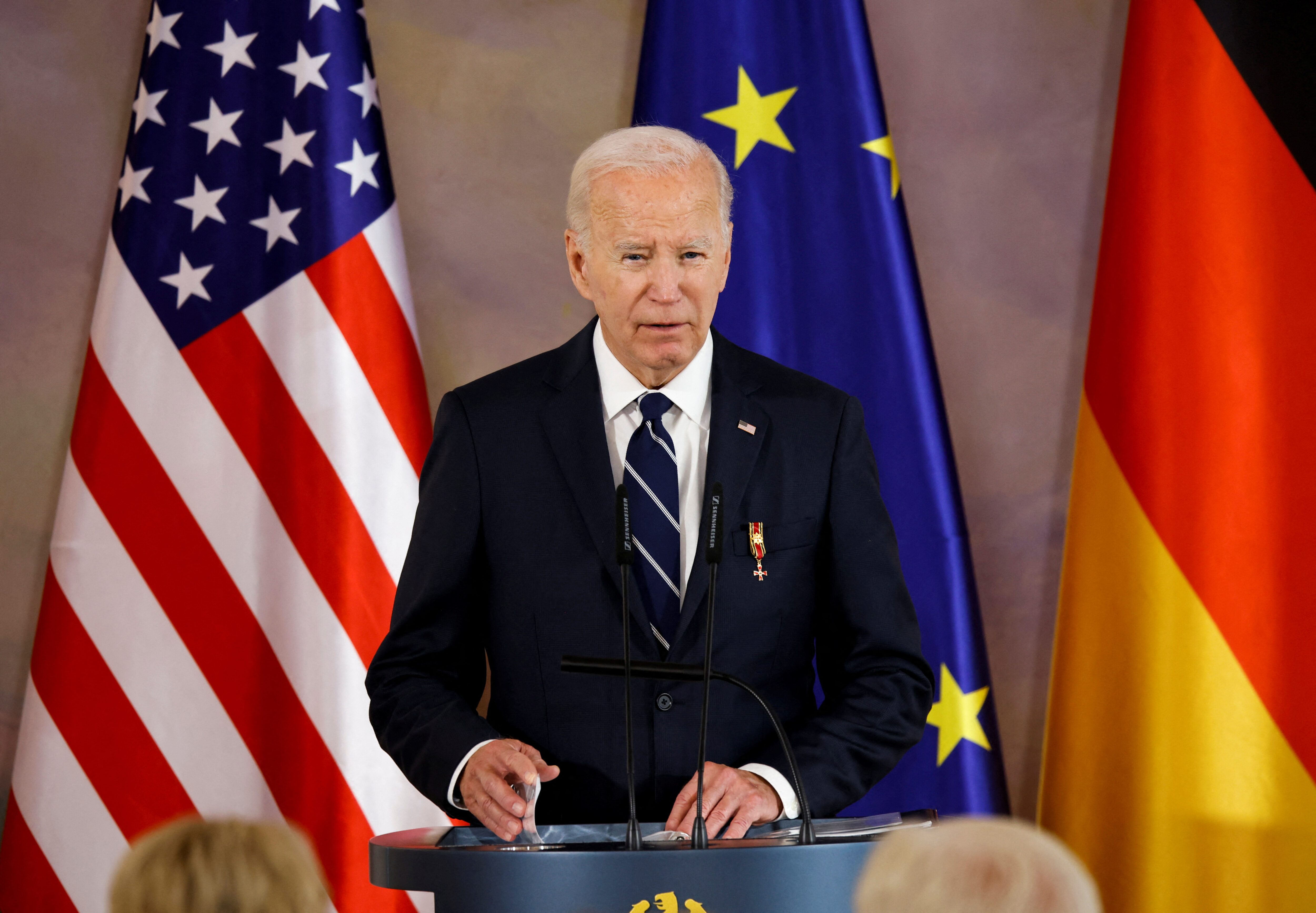 美國總統喬·拜登在德國柏林貝爾維尤宮參加授予他德國最高榮譽——功勳勳章大十字的儀式上發言,授勳者為弗蘭克-瓦爾特·施泰因邁爾總統(未出現在照片中),2024年10月18日。路透社/阿克塞爾·施密特 “在我看來,有一個機會,我的同事們也同意,我們可能以一種結束衝突的方式處理以色列和伊朗。換句話説,結束衝突,停止反覆的爭鬥,”拜登説。