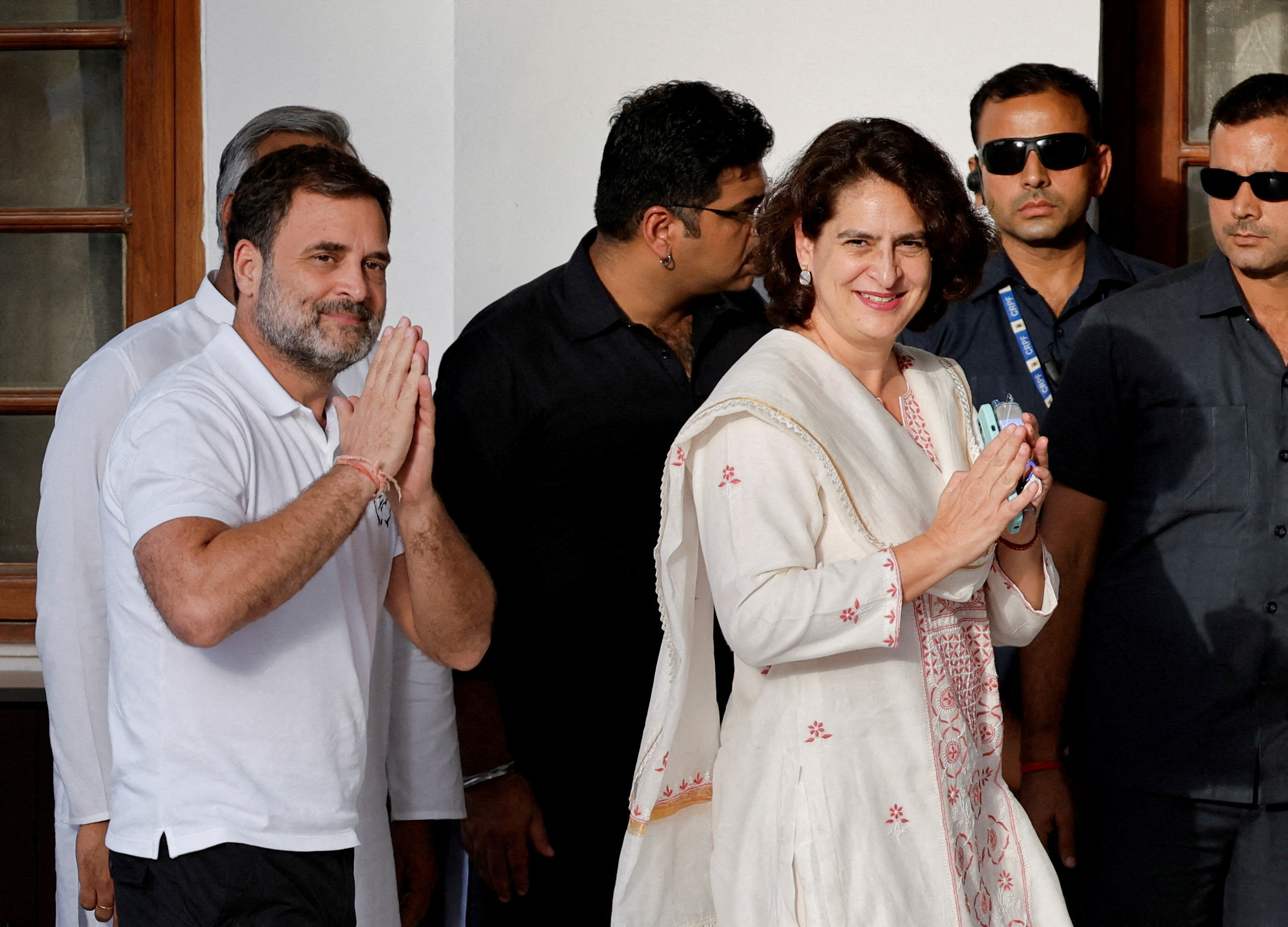 印度主要反對黨國大黨的高級領導人拉胡爾·甘地及其妹妹普里揚卡·甘地·瓦德拉在2024年6月5日印度國家發展包容聯盟(INDIA)會議當天在印度新德里做出手勢。路透社/阿德南·阿比迪/檔案照片新德里,10月23日(路透社) - 普里揚卡·甘地·瓦德拉,印度尼赫魯-甘地王朝的後裔,週三提交了她的提名,參加國會選舉,這是來自一個主導政治併為國家提供了三位總理的家族的最新候選人。