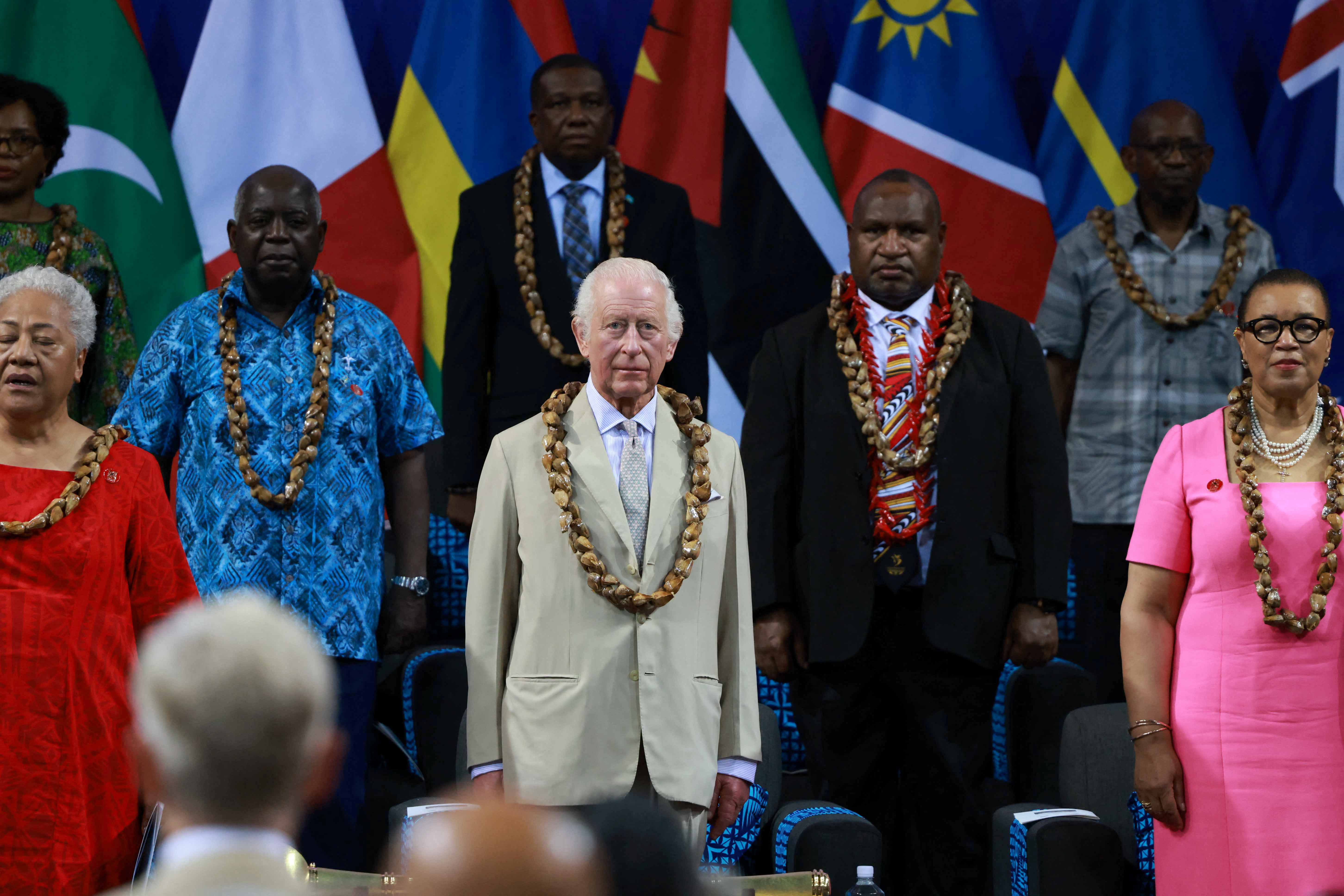 第1項,共2項 查爾斯三世國王出席2024年10月25日在薩摩亞阿皮亞舉行的英聯邦政府首腦會議開幕式。伊恩·沃格勒/路透社