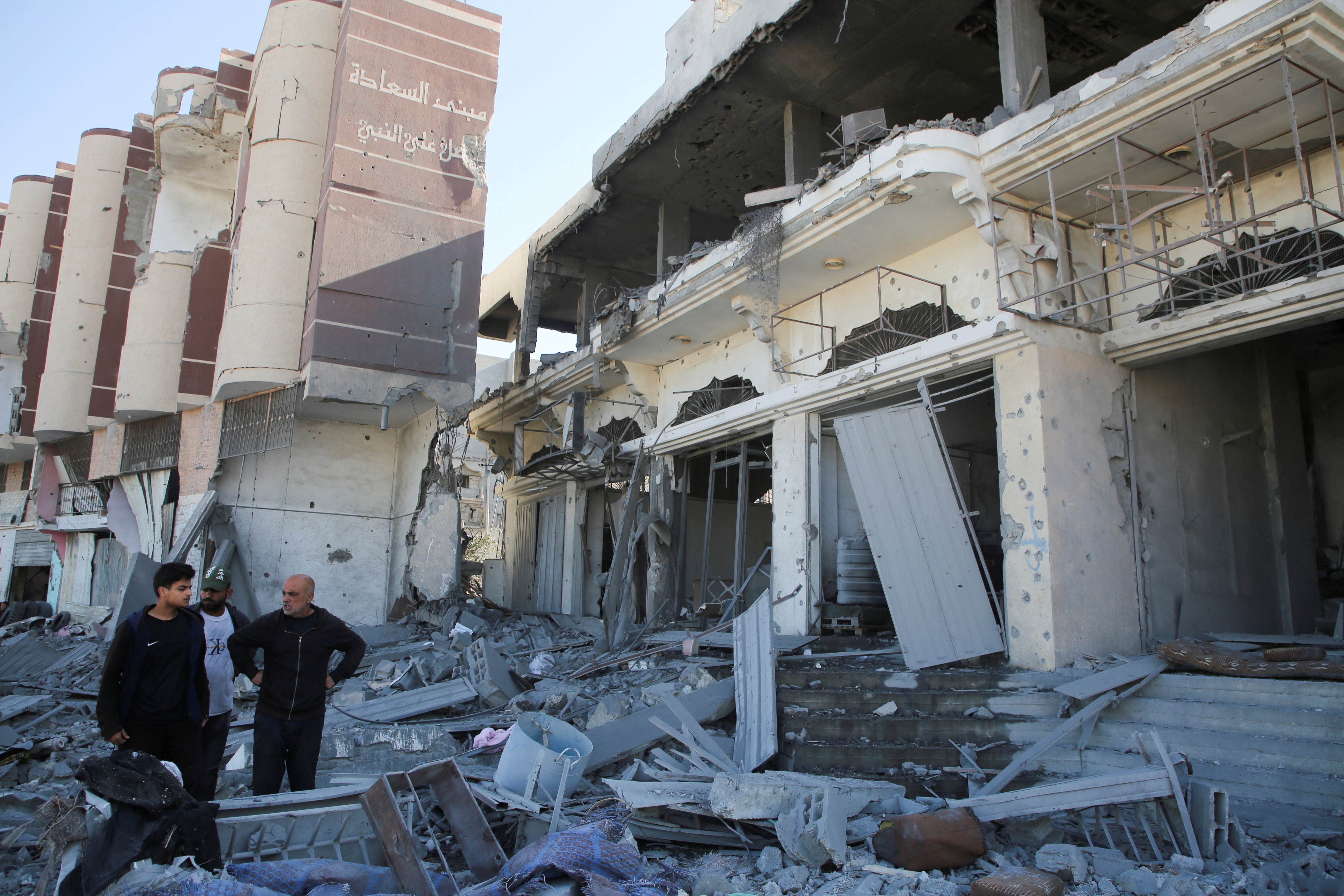兩名巴勒斯坦人在以色列對一所房屋的襲擊現場進行檢查,地點位於加沙地帶南部的汗尤尼斯,時間為2024年10月30日。路透社/哈特姆·哈立德