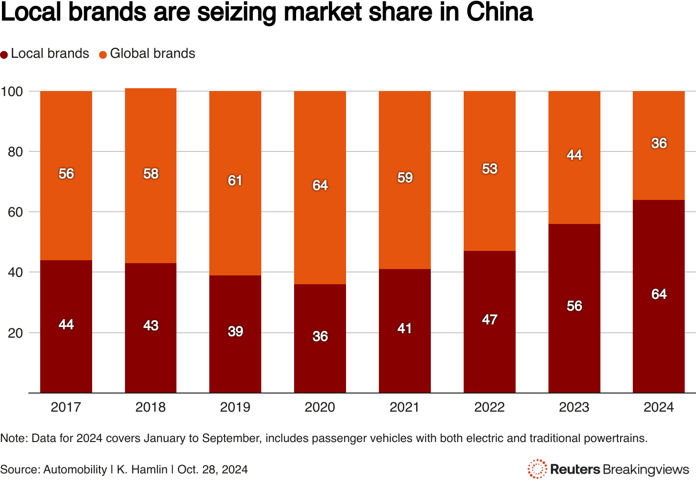 顯示本地品牌在中國乘用車市場的份額正在增長。2024年1月至8月,本地品牌佔銷售額的近三分之二。