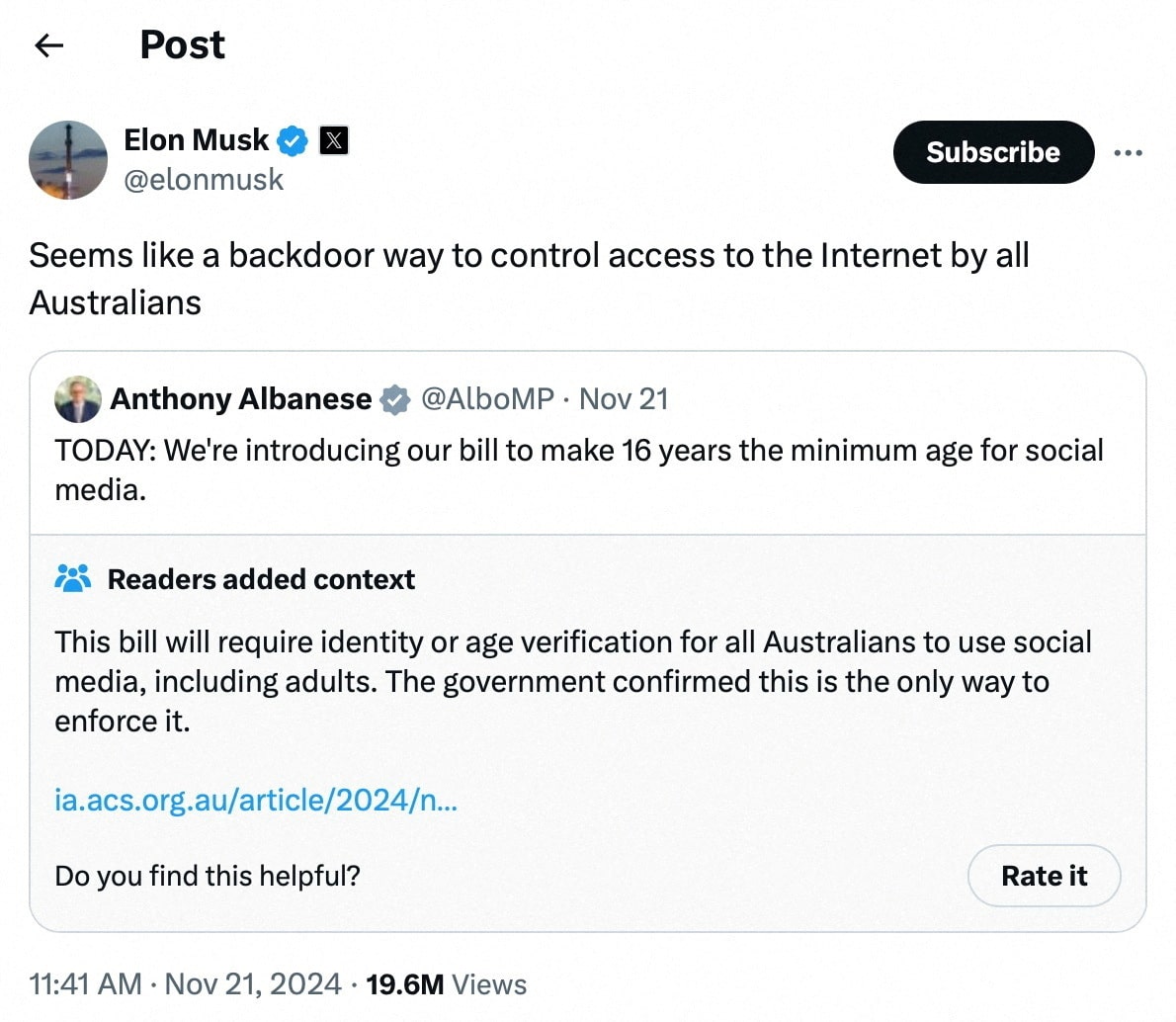 第1項,共2項 一張截圖顯示了埃隆·馬斯克在2024年11月21日關於澳大利亞社交媒體監管法案的X平台上的帖子,這張圖片來自社交媒體。埃隆·馬斯克通過X/路透社/檔案照片