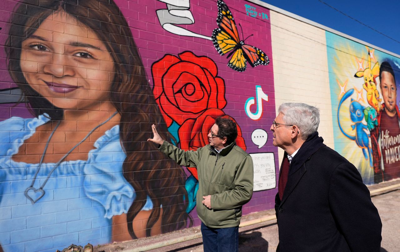 1月17日,藝術家阿貝爾·奧爾蒂斯(左)向身着黑色外套的加蘭部長展示紀念烏瓦爾德校園槍擊遇難者的壁畫。照片:埃裏克·蓋伊/新聞池遇難者家屬週四表示,他們感謝司法部對此事的關注,並希望這將推動地方檢察官的調查,他們擔心調查已經停滯,並且阻礙了他們獲取關於孩子死亡的更多信息。他們還稱這份報告在一個分裂的社區中非常重要,那裏許多人對持續討論槍擊事件感到不滿。