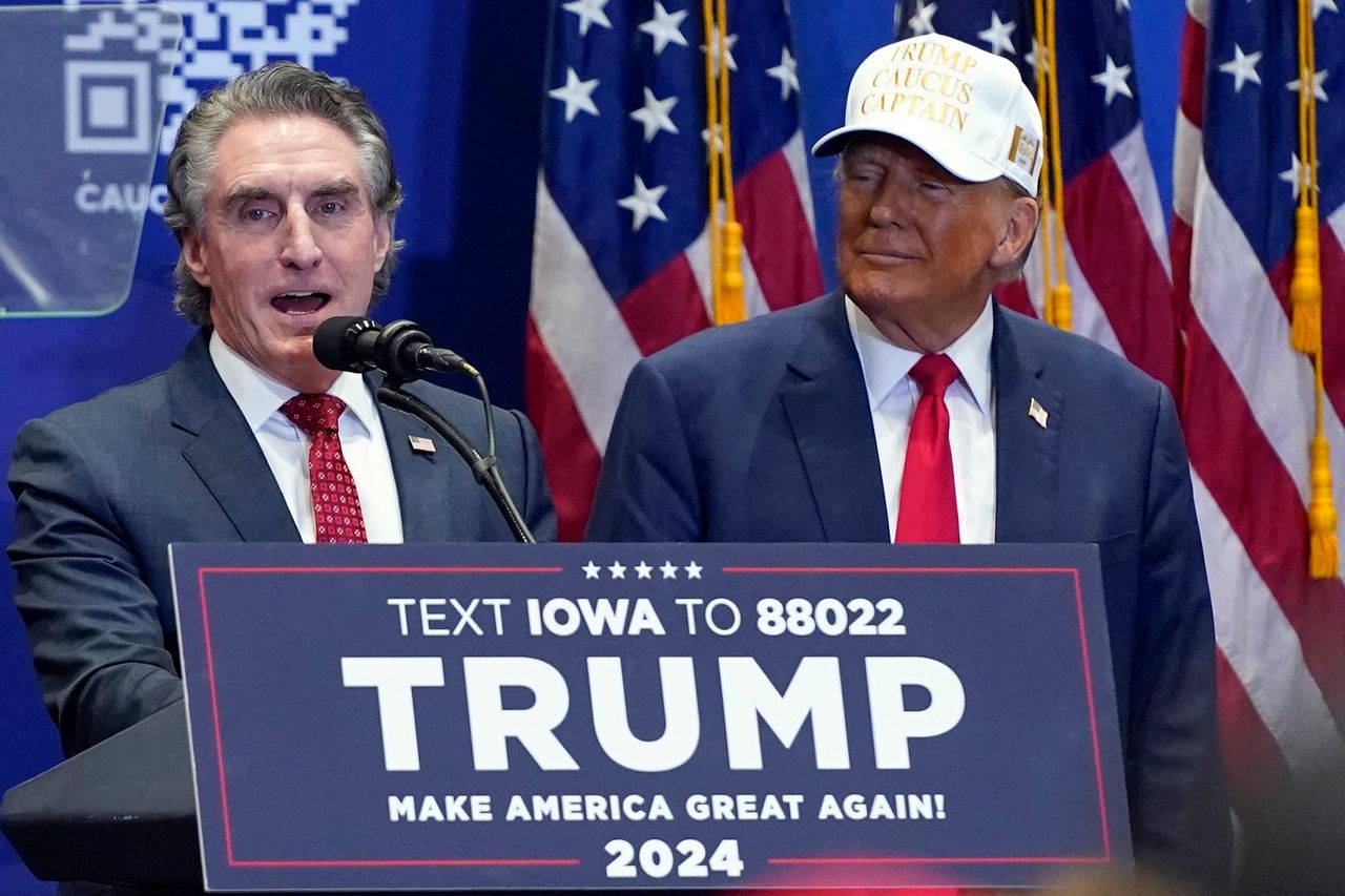 唐納德·特朗普在愛荷華州印第安諾拉市的競選集會上聆聽北達科他州州長道格·伯古姆的講話,1月14日。圖片來源:安德魯·哈尼克/美聯社刊登於2024年1月20日印刷版,標題為《這不僅是特朗普的選舉》。