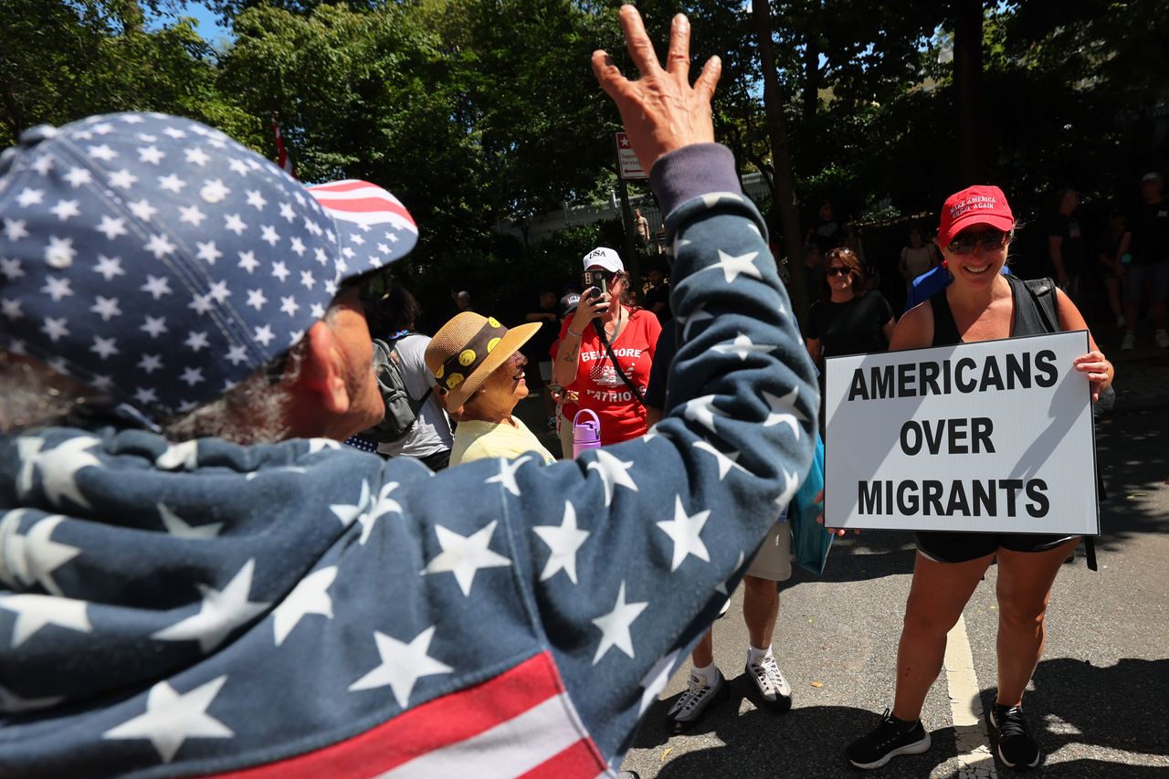 反移民抗議活動(如圖中8月曼哈頓示威)已成為共和黨集會的常態,並體現在候選人巡迴演講中。圖片來源:Michael M. Santiago/Getty Images時間快進到本次競選,在首場2024年共和黨辯論中,德桑蒂斯宣稱:“我任總統時的特赦人數將是零,這個國家不能實行特赦。“黑莉隨即補充:“必須驅逐他們。“而特朗普則公開宣稱移民正在"毒害美國的血液”。