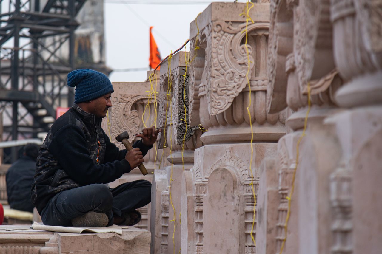 儘管如此,近月來羅摩信徒仍歡聚聖城。有人付費在額前用紅黃粉末繪出羅摩之名。秋日午後,乘夜班車抵達阿約提亞的一羣遊客駐足於印度教團體運營的石雕工坊——三十年間,工匠們已雕刻數十根粉砂岩柱。“這些是給寺廟用的嗎?”65歲的社會工作者香塔·賈因身着藏紅花色紗麗,難掩興奮地問道。“是的,用於二層。”正在擦拭石柱的金格爾·薩尼回答。