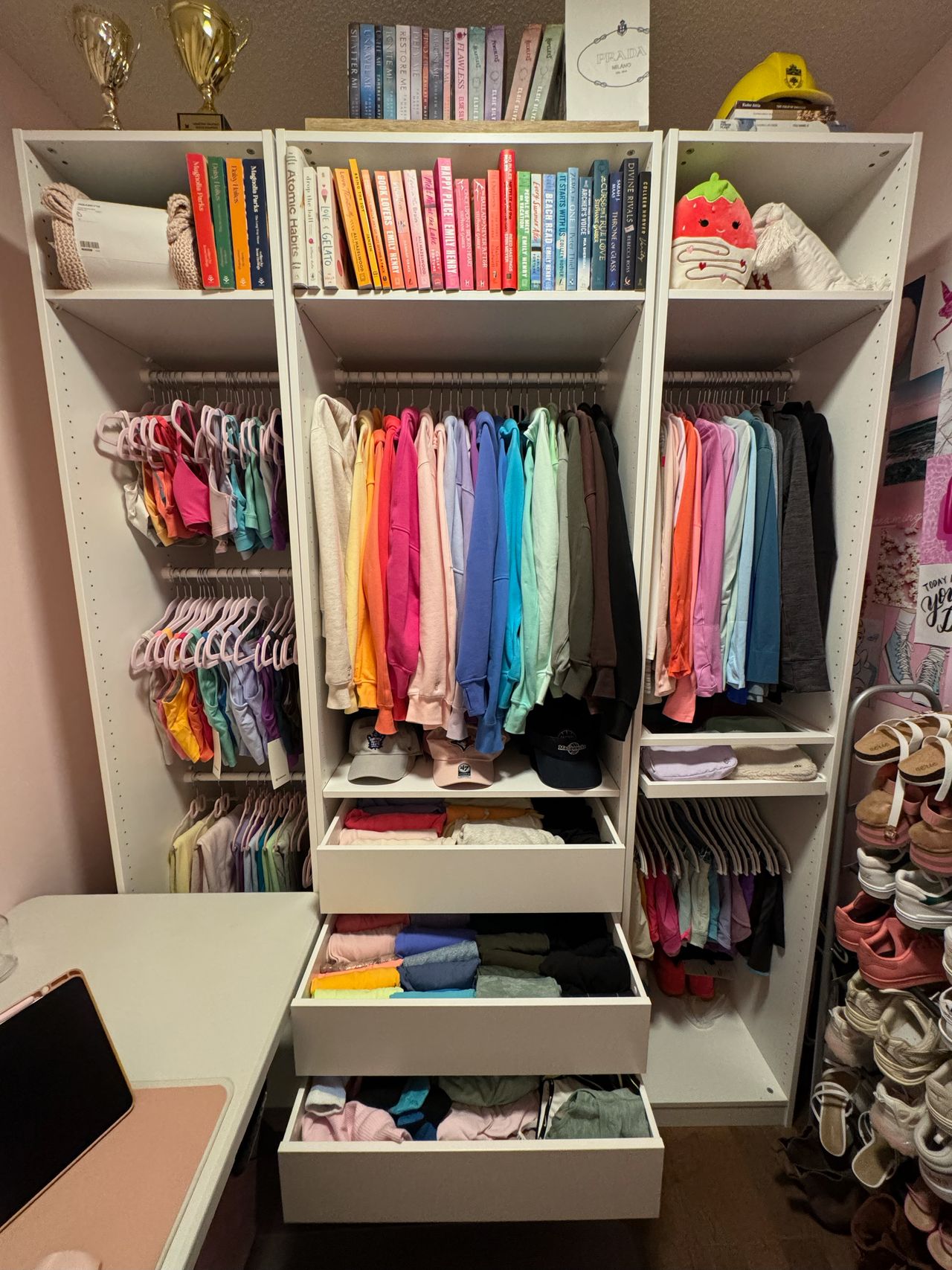 周怡琳(Erin Chau)有一個專門的運動休閒衣櫃,露露樂蒙的衣物佔據了大部分空間。圖片來源:周怡琳大多數夜晚,周怡琳都會在她的運動休閒衣櫃前駐足,思考第二天要穿什麼。她幾乎總是從自己擁有的100件露露樂蒙連帽衫、運動文胸、短褲和其他服裝中挑選,其中許多同款都有多種顏色,還有成套的服裝。