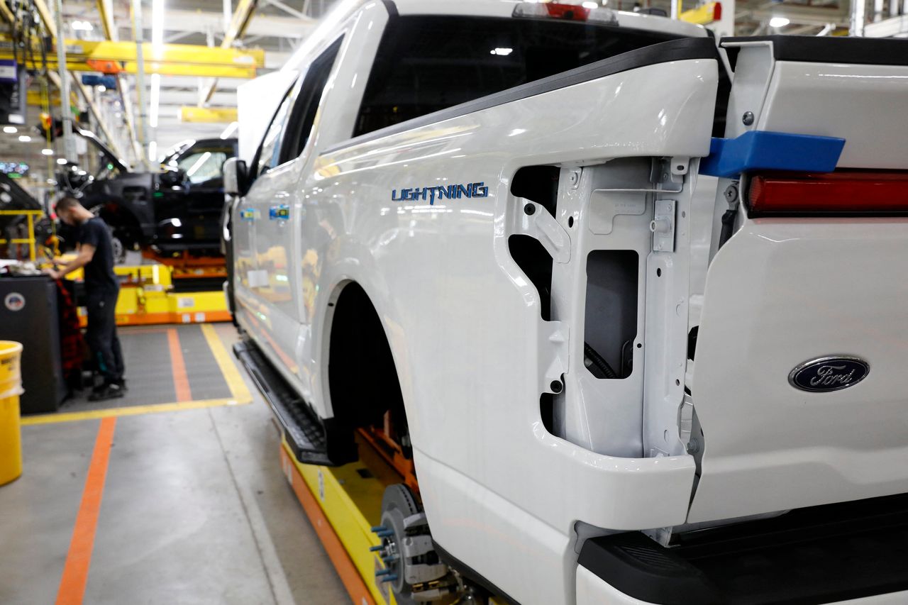 福特汽車在密歇根州迪爾伯恩的Rouge電動車中心生產F-150 Lightning電動卡車。照片:傑夫·科瓦爾斯基/法新社/蓋蒂圖片社刊登於2024年1月20日印刷版,標題為《電動汽車反彈加劇》。