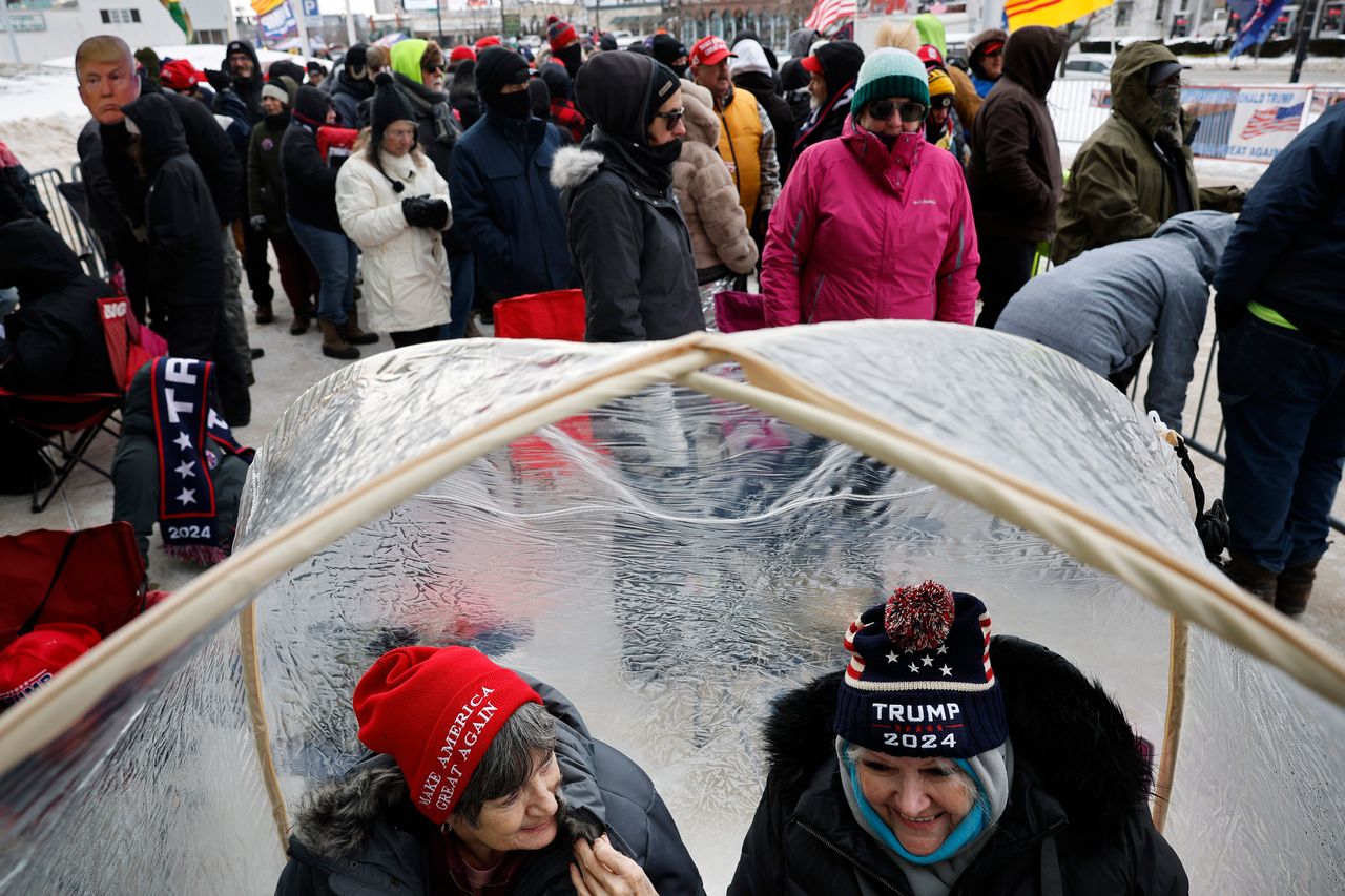 週六,一羣人不畏嚴寒參加在新罕布什爾州曼徹斯特舉行的特朗普集會。圖片來源:Chip Somodevilla/Getty Images最近的全國民調顯示,這場競選勢均力敵,或者特朗普略微領先,但如果一項刑事定罪導致特朗普失去哪怕一小部分支持者,都可能改變競選格局——這取決於這些選民是決定不參加選舉還是選擇其他選項。拜登的支持率處於歷史低點,他一直強調特朗普不適合擔任公職,並且是對民主的威脅。
