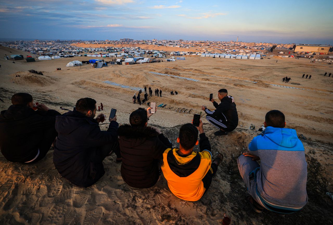 拉法營地的流離失所巴勒斯坦人試圖聯繫親屬。圖片來源:Agence France-Presse/Getty Images以色列表示已摧毀哈馬斯過半戰鬥營,並基本清除了該飛地最大城市加沙城及周邊地區的武裝分子。但其軍隊目前正在飛地南部人口密集的汗尤尼斯作戰,並預計將在邊境城鎮拉法發生衝突,那裏有超過130萬平民尋求避難。