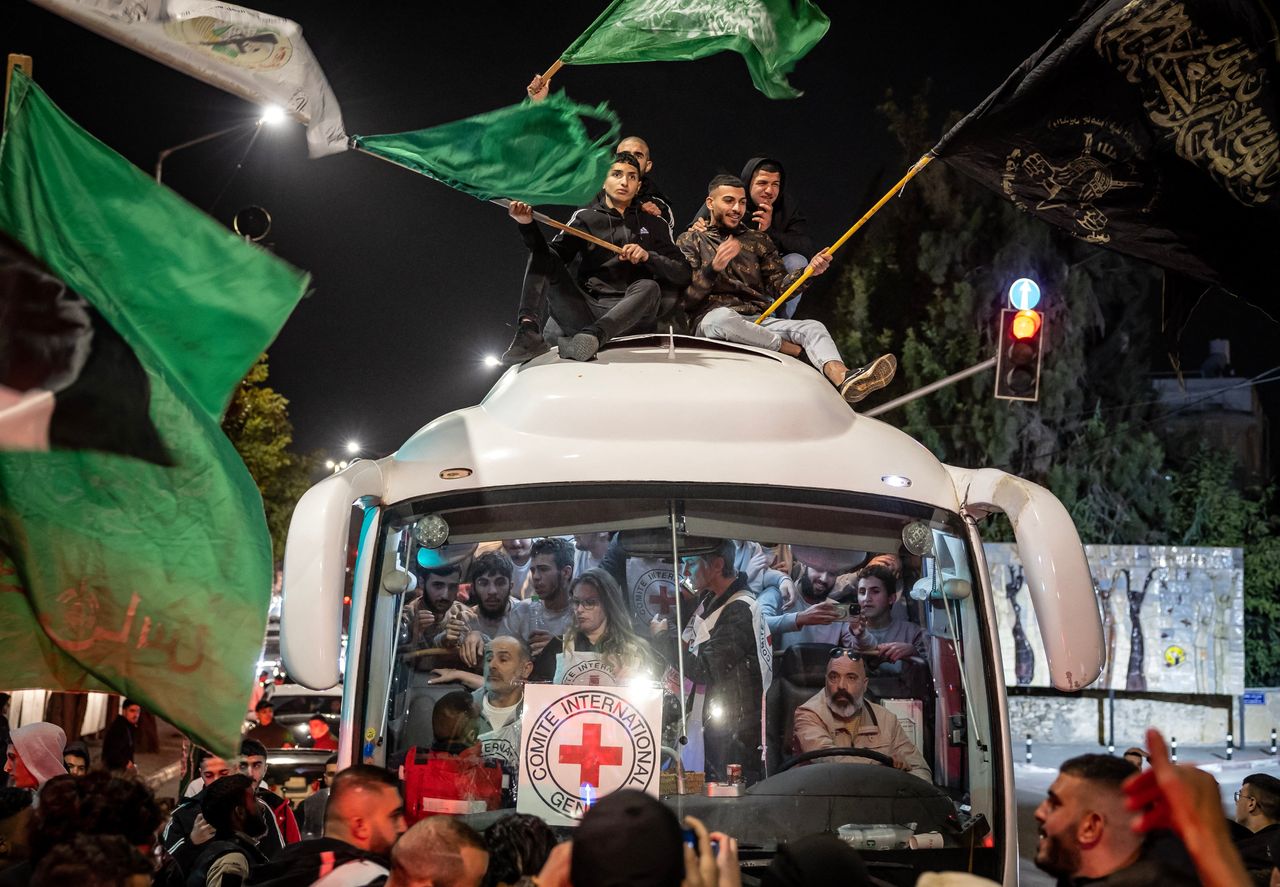 11月,一輛紅十字巴士運送從以色列監獄釋放的巴勒斯坦人。圖片來源:Fadel Senna/法新社/蓋蒂圖片社