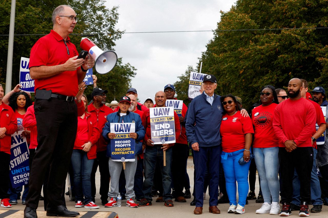 全美汽車工人聯合會主席肖恩·費恩在發言,當時拜登總統於九月份加入了密歇根州貝爾維爾罷工糾察線的成員們。圖片來源:EVELYN HOCKSTEIN/REUTERS在密歇根州,拜登的競選團隊投放了廣告,將總統在製造業就業和支持美國汽車行業的記錄與特朗普的進行對比。這些訴求包括拜登決定加入全美汽車工人聯合會的糾察線,這是在去年針對美國汽車製造商的協調罷工期間,美國總統前所未有的舉動。