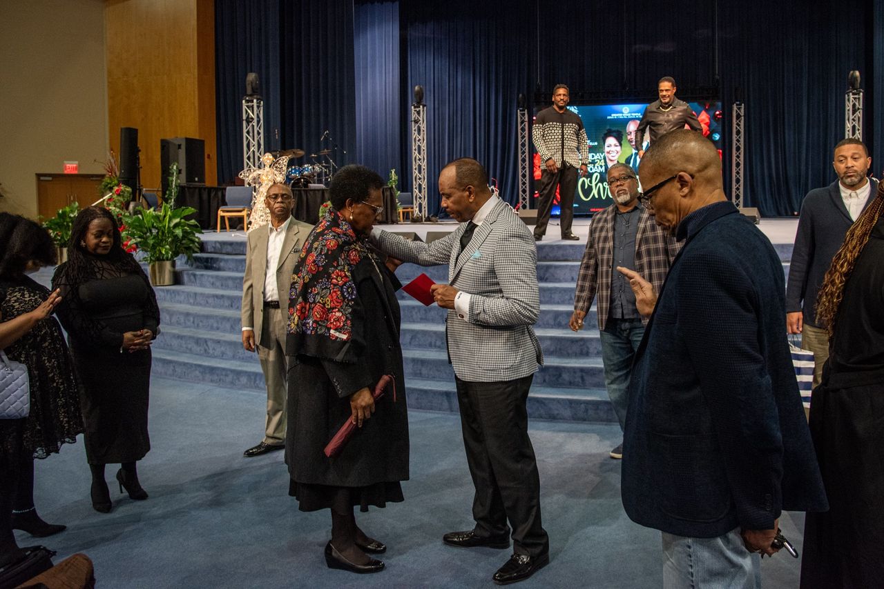 位於中心的查爾斯·H·埃利斯三世主教表示,大恩典堂教會在2020年通過大規模缺席投票操作推動了投票率的顯著提升。照片:《華爾街日報》Cydni Elledge該教會在歷屆選舉中持續推動選民投票工作。查爾斯·H·埃利斯三世主教回憶稱,2020年會眾通過缺席投票實現了"巨大飛躍”。他預計隨着大選臨近,這種參與度還將持續增長。