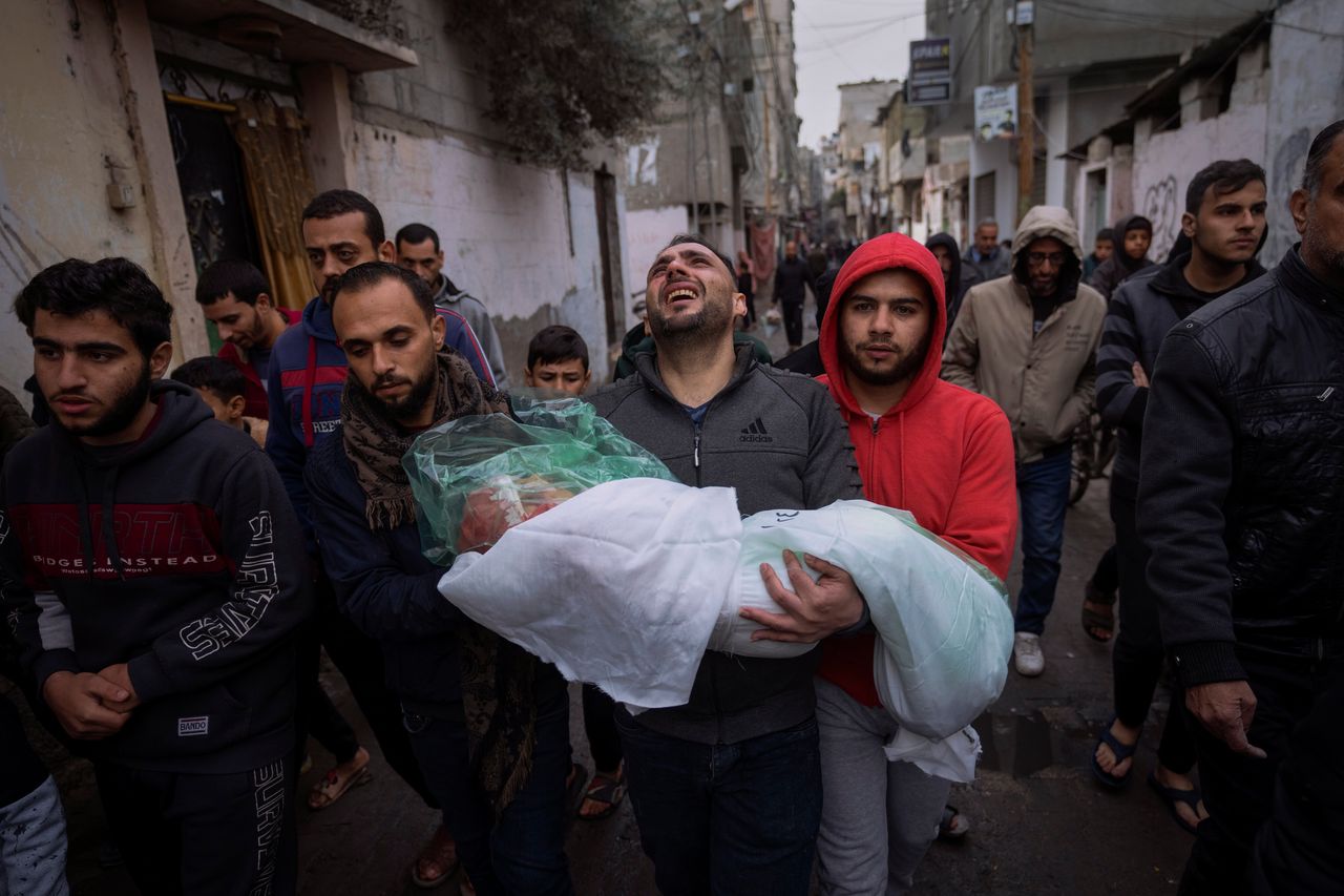 一名男子在拉法舉行的女兒葬禮上抱着她的遺體。圖片來源:法蒂瑪·什拜爾/美聯社
