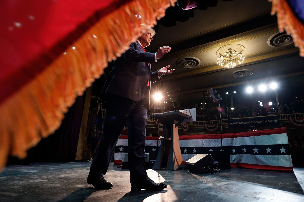 距西布魯克"黑利-蘇努努歡慶會"一小時車程外,當支持者們在新罕布什爾州羅切斯特風景如畫的百年歌劇院等候特朗普亮相時,該黨的蜕變展現得淋漓盡致。人羣明顯以藍領為主,腳蹬工裝靴、身刺紋身,洋溢着其他候選人活動中罕見的喧鬧能量。入口處的商品卡車兜售着"特朗普2024:好戲在後頭"T恤和"布蘭登加油"旗幟(後者暗指反拜登總統的梗)。特朗普登台前,州共和黨副主席瑞安·特雷爾通過頌揚特朗普"反全球主義者的抗爭"來煽動現場氣氛。