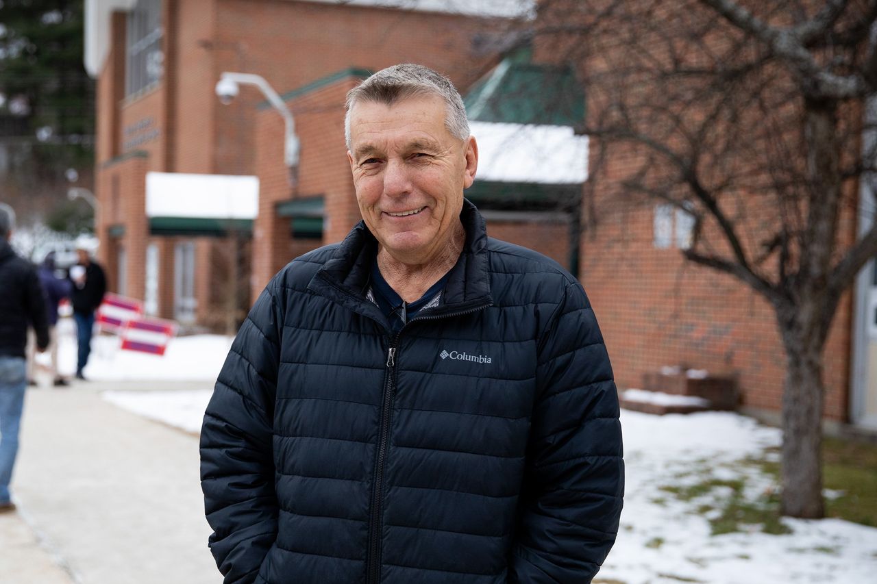 週二,特朗普的支持者聚集在哈德遜社區中心外等待投票。圖片來源:Kayana Szymczak for The Wall Street Journal"他是唯一能拯救這個國家的人。“69歲的卡車司機史蒂文·蘭根在納舒厄市投票站外説道。