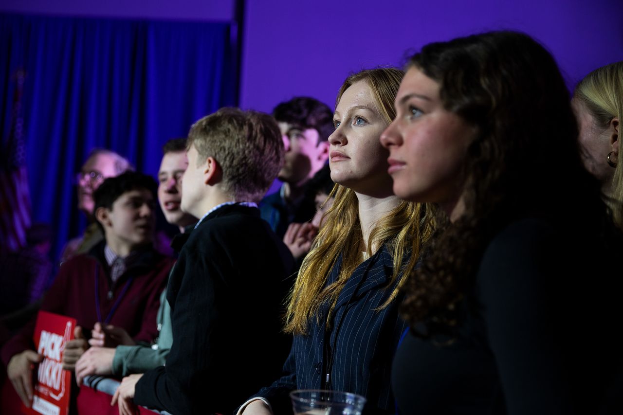新罕布什爾州康科德市,尼基·黑利的初選觀戰派對現場,支持者等待投票結果。圖片來源:Kayana Szymczak/華爾街日報更關鍵的是,參與共和黨初選的獨立選民中,66%明確表示若特朗普成為提名候選人,將不會在11月大選中投票給他。