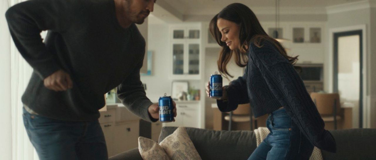 在抵制風波爆發前的2023年超級碗廣告中,百威淡啤一改品牌往日張揚的廣告風格,通過展現演員邁爾斯·泰勒與妻子凱莉·泰勒將電話等待音樂變成客廳舞會的60秒短片實現轉型。