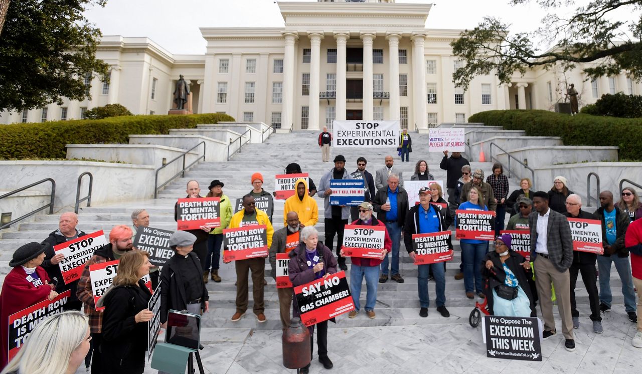 反對這種處決方式的示威者週二聚集在阿拉巴馬州議會大廈前。圖片來源:米基·威爾士/蒙哥馬利廣告報/美聯社史密斯的律師表示,他們對這次處決深感悲痛。