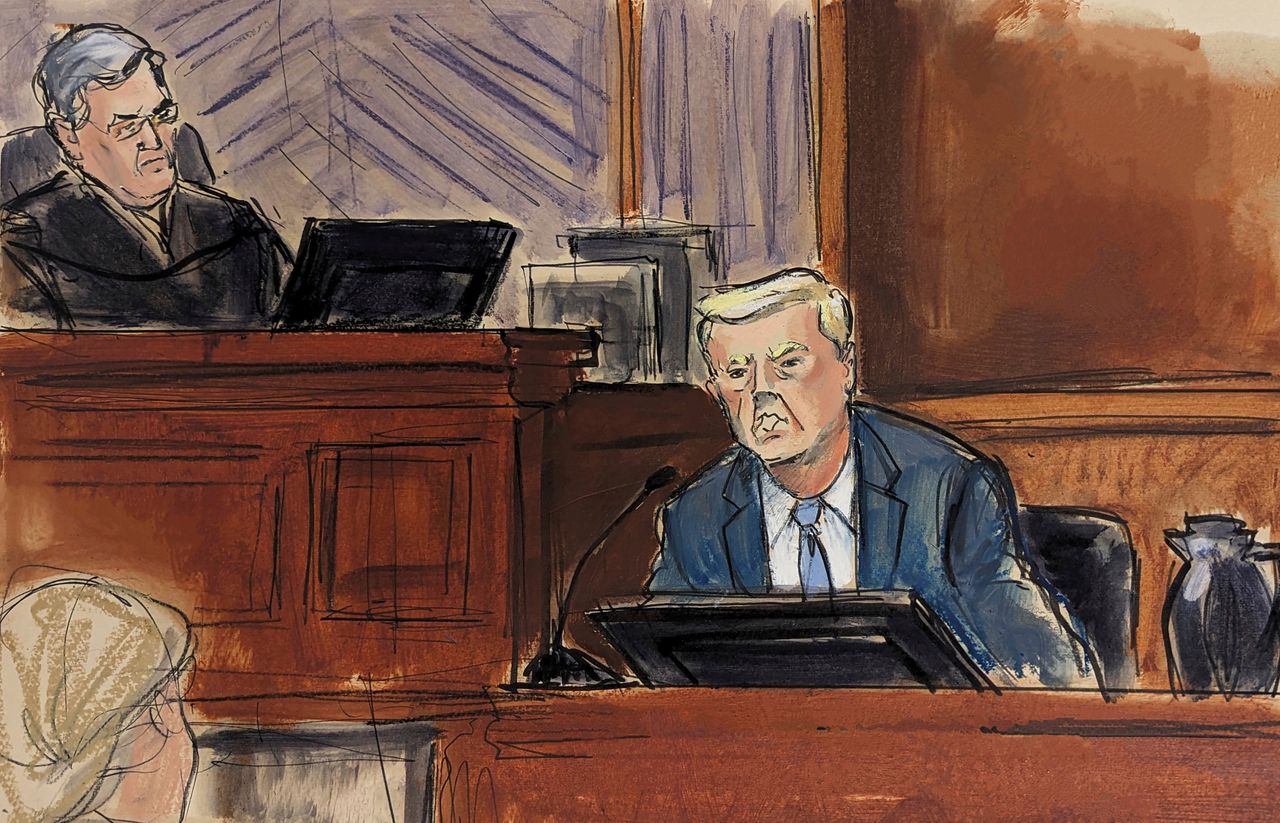 在這幅法庭素描中,美國前總統唐納德·特朗普於週四在紐約聯邦法院作證。圖片來源:伊麗莎白·威廉姆斯/美聯社唐納德·特朗普週四僅出庭作證三分鐘,試圖反駁作家E·簡·卡羅爾的指控,即她有權因誹謗向前總統索要金錢賠償。
