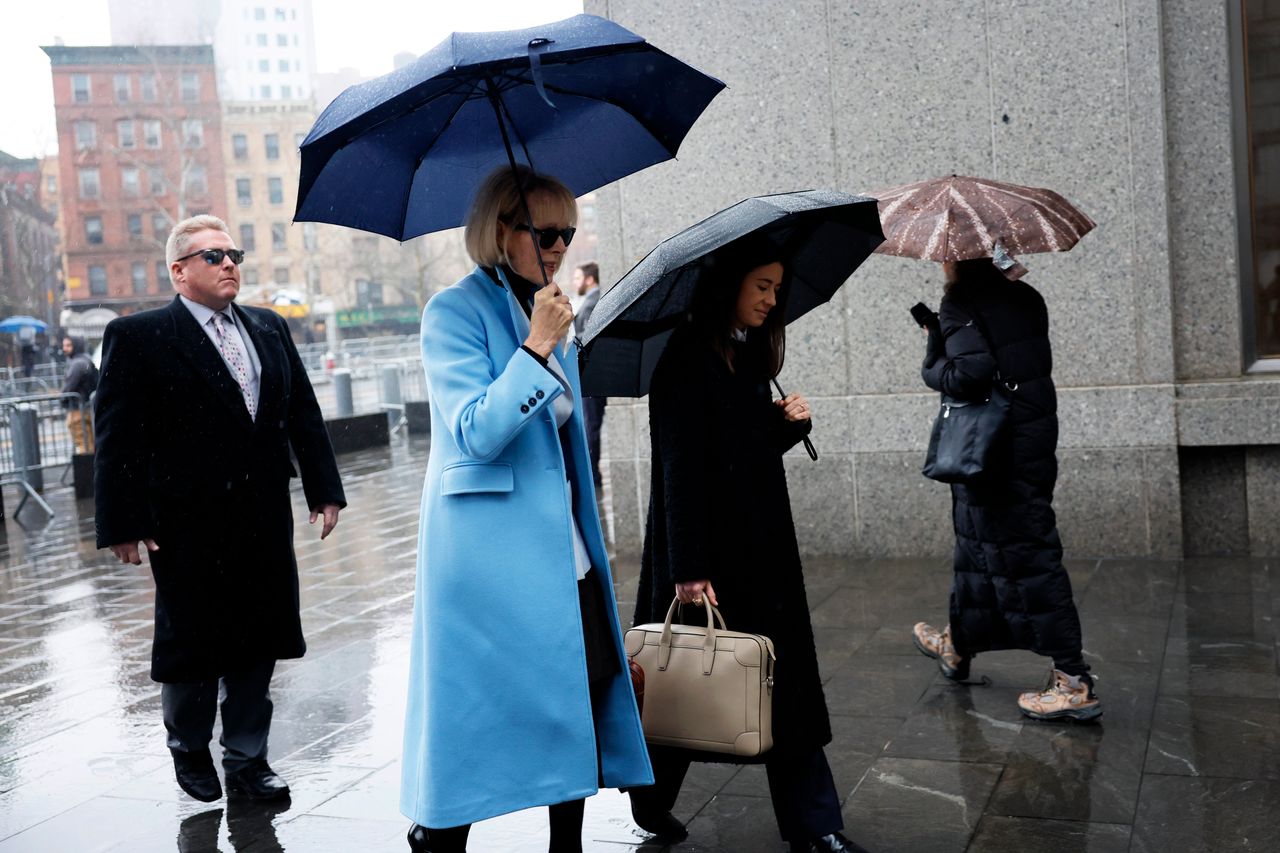 作家E·簡·卡羅爾週四抵達紐約參加誹謗案庭審。圖片來源:Michael M. Santiago/Getty Images法庭上,哈巴律師詢問特朗普是否曾在2019年就記者提問公開否認卡羅爾的指控。