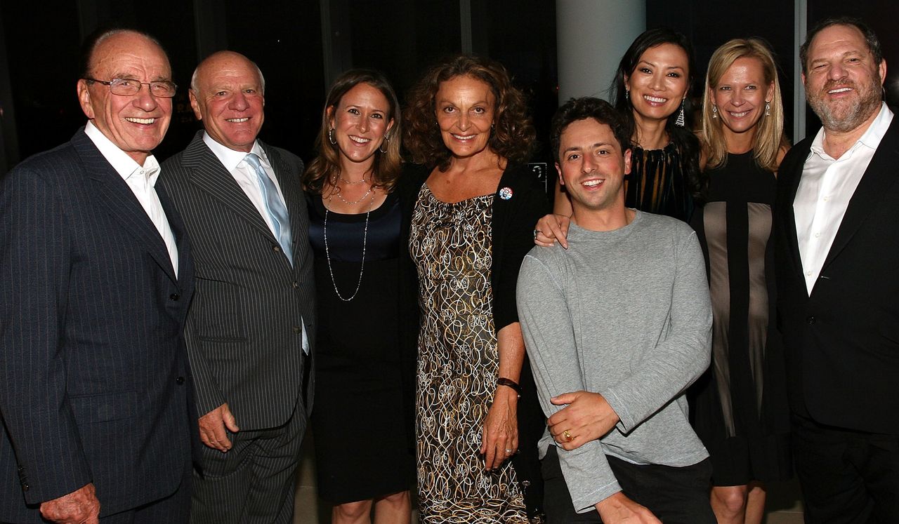 從左至右:魯珀特·默多克、巴里·迪勒、沃西基、黛安·馮芙絲汀寶、謝爾蓋·布林、鄧文迪、琳達·艾維和哈維·韋恩斯坦在2008年紐約的一場23andMe唾液派對上。照片:Donald Bowers/Getty Images for The Weinstein Company在辦公室裏,沃西基努力保持公司文化的有趣氛圍。她買了一個遙控放屁機,她的秘書把它放在艾維的座位上,當兩人走進辦公室時啓動它。