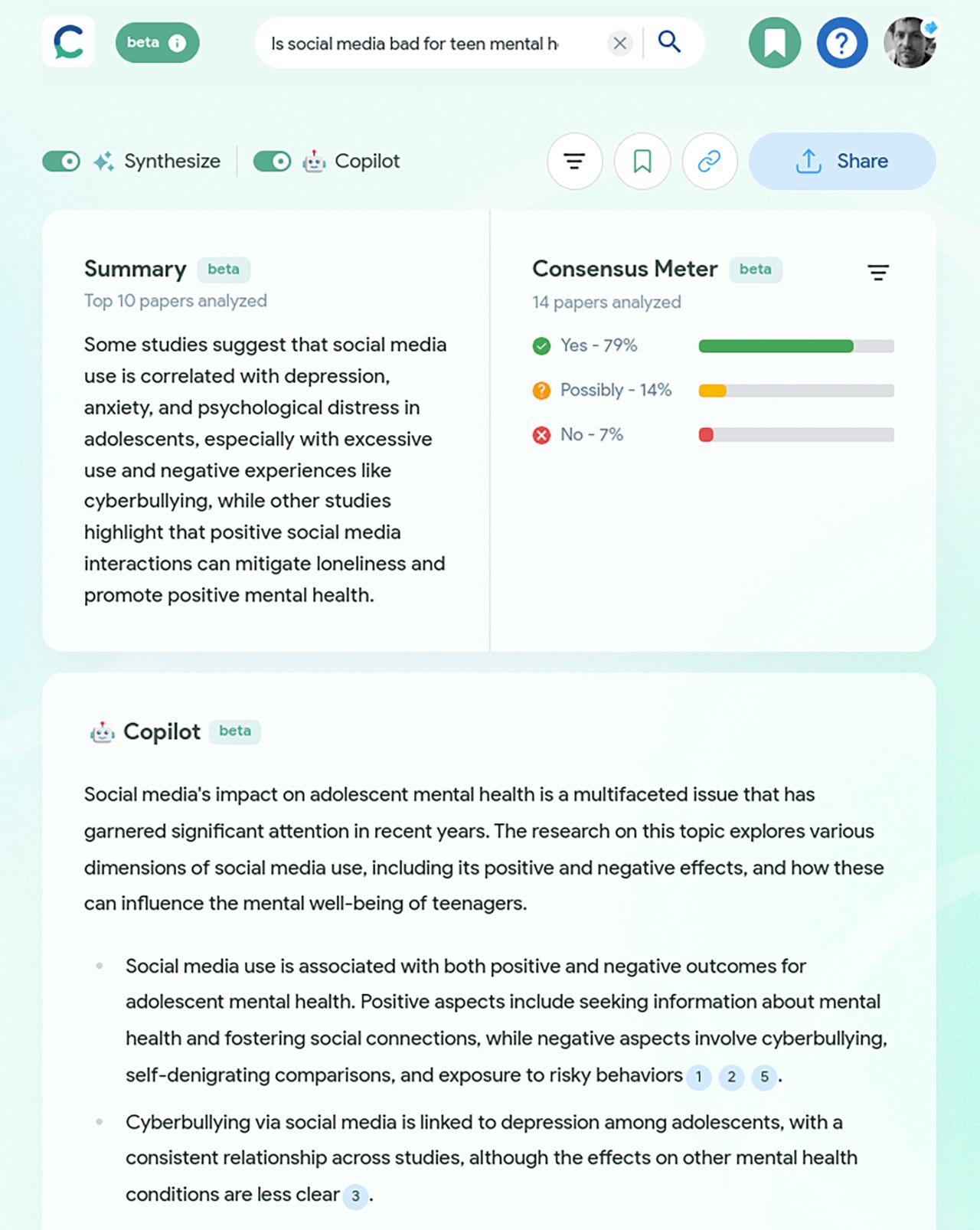 詢問Consensus關於社交媒體是否對青少年心理健康有害的問題提供了一個有啓發性的例子:Consensus使用人工智能總結了該主題的10篇論文,然後對這一問題研究結果的多樣性進行了更詳細的分解,其中每篇引用的論文都單獨進行了總結。