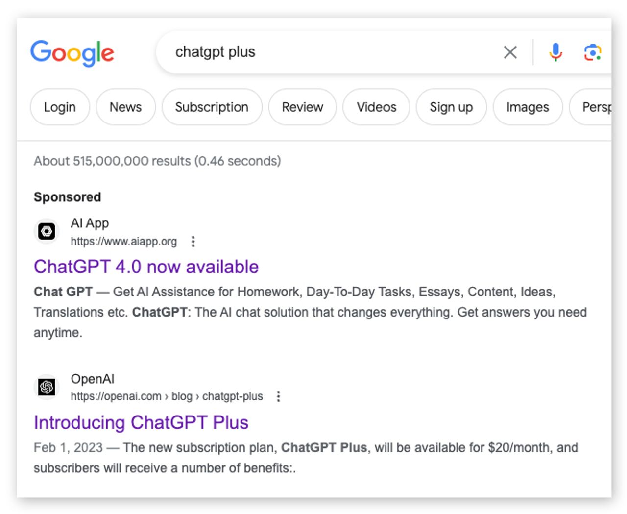 谷歌首個贊助鏈接顯示"ChatGPT 4.0現已推出”,卻跳轉至非OpenAI運營的網站。該服務同樣收取20美元月費,但提供的是舊版免費軟件。