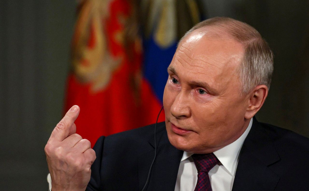 俄羅斯總統弗拉基米爾·普京在莫斯科克裏姆林宮接受塔克·卡爾森採訪時回答問題,2月9日。圖片來源:加夫里爾·格里戈羅夫/克里姆林宮泳池/Zuma Press
