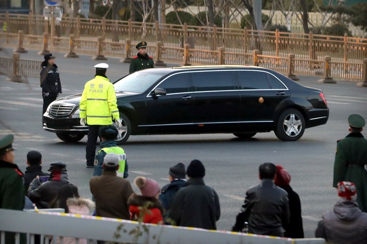 2019年北京安保人員在一輛被認為載有朝鮮領導人金正恩的梅賽德斯-奔馳豪華轎車附近警戒。圖片來源:Mark Schiefelbein/Associated Press金正恩對汽車的痴迷在這個封閉政權內外眾所周知。朝鮮學生曾被教導金正恩3歲就學會了開車。2018年新加坡峯會期間,金正恩與時任美國總統特朗普散步時特意查看了後者的總統座駕,還探頭窺視車內。