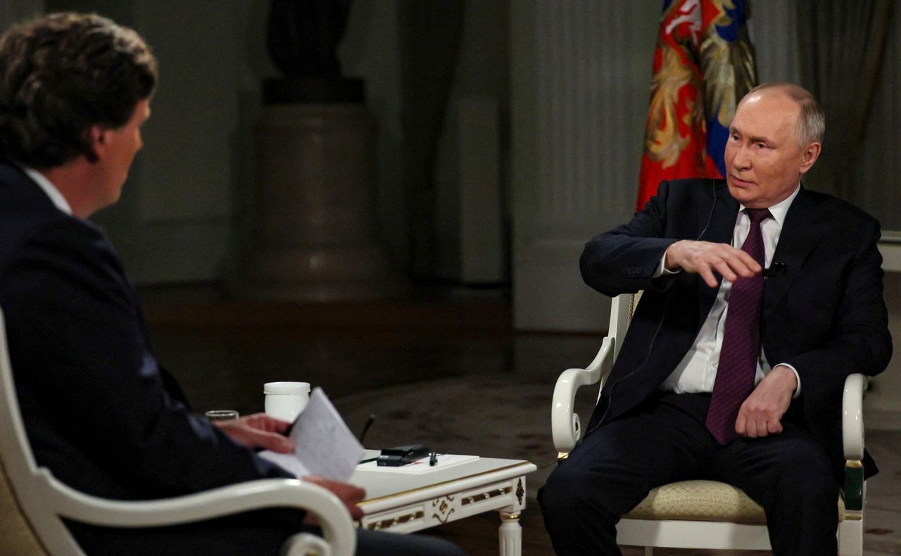 2月9日,弗拉基米爾·普京在莫斯科克裏姆林宮接受塔克·卡爾森採訪時回答提問。圖片來源:Gavriil Grigorov/Kremlin Pool/Zuma Press弗拉基米爾·普京給西方上了一堂歷史課。在最近接受塔克·卡爾森採訪時,普京重申了他認為俄羅斯對烏克蘭擁有主權的信念,他稱烏克蘭是俄羅斯於862年建立的。除了東歐歷史專家,美國人可能根本不明白普京在説什麼。