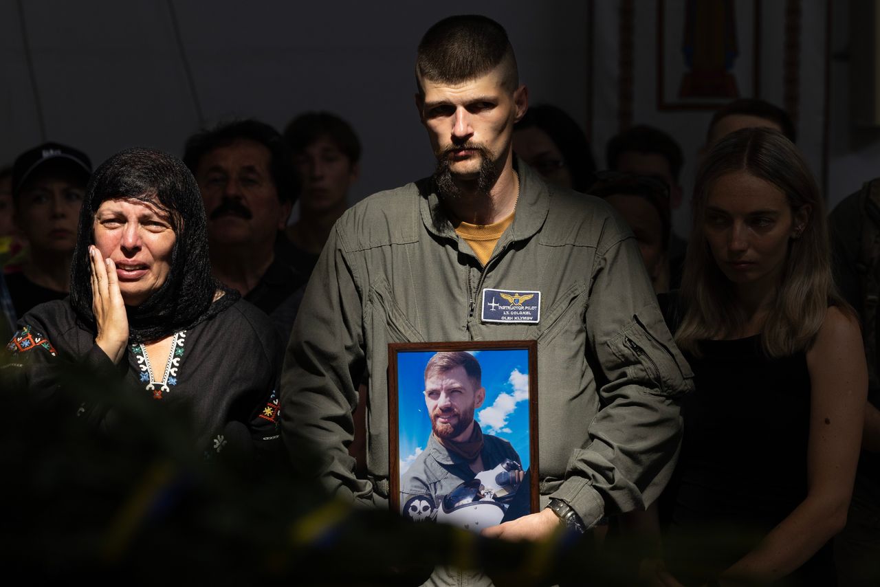 2023年8月29日,安德烈·“朱斯”·皮爾什奇科夫的母親莉莉婭·阿維里亞諾娃與烏克蘭空軍中校奧列格·克利莫夫在基輔舉行的葬禮上悼念朱斯。圖片來源:保拉·布朗斯坦/蓋蒂圖片社烏克蘭政府通報兩架戰鬥訓練機"在執行訓練飛行時相撞”。與朱斯戰友交談過的斯沃特法格上校透露:“朱斯當時只是坐在後座陪同訓練,幫忙指導,本不在當天的飛行名單上。“朱斯的母親阿維里亞諾娃女士表示,兒子因"彈射後着陸失敗遭受致命傷"而犧牲,另有兩名飛行員遇難。