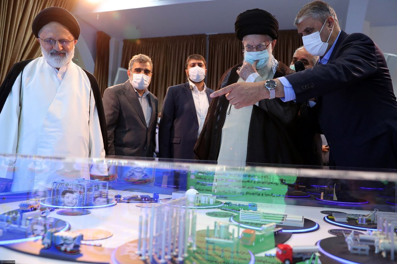 伊朗最高領袖阿亞圖拉阿里·哈梅內伊(右二)在德黑蘭參觀核工業展覽。圖片來源:伊朗最高領袖辦公室/Zuma Press60%濃縮鈾的減少將為美國及其歐洲夥伴提供喘息之機,這些國家日益擔憂伊朗核計劃的擴張。