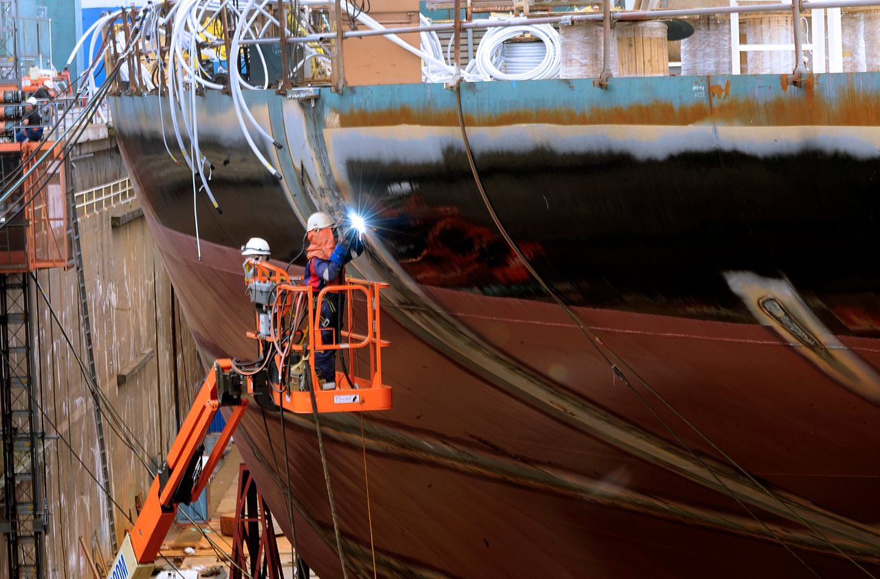 2012年6月19日,費城阿克造船廠的一名焊工正在建造中的石油油輪船體上作業。圖片來源:彭博社