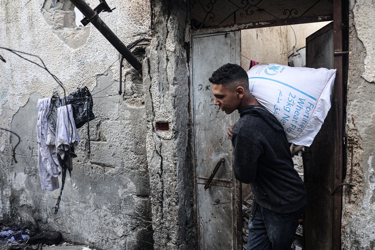 一名男子在拉法被毀房屋中搶救出一袋麪粉。圖片來源:said khatib/法新社/蓋蒂圖片社聯合國對加沙的援助物資從埃及運抵凱雷姆沙洛姆口岸,經以色列檢查後通過卡車轉運至分發中心,再重新裝車組成車隊送往加沙中部和南部的分發站點。