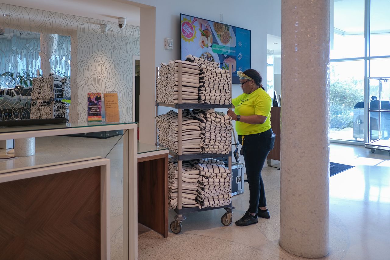 前台接待員賈琳·羅薩多同時兼任泳池毛巾服務員。如今,酒店業正嘗試通過多種方式減少人力需求,這加劇了潛在僱員的顧慮。