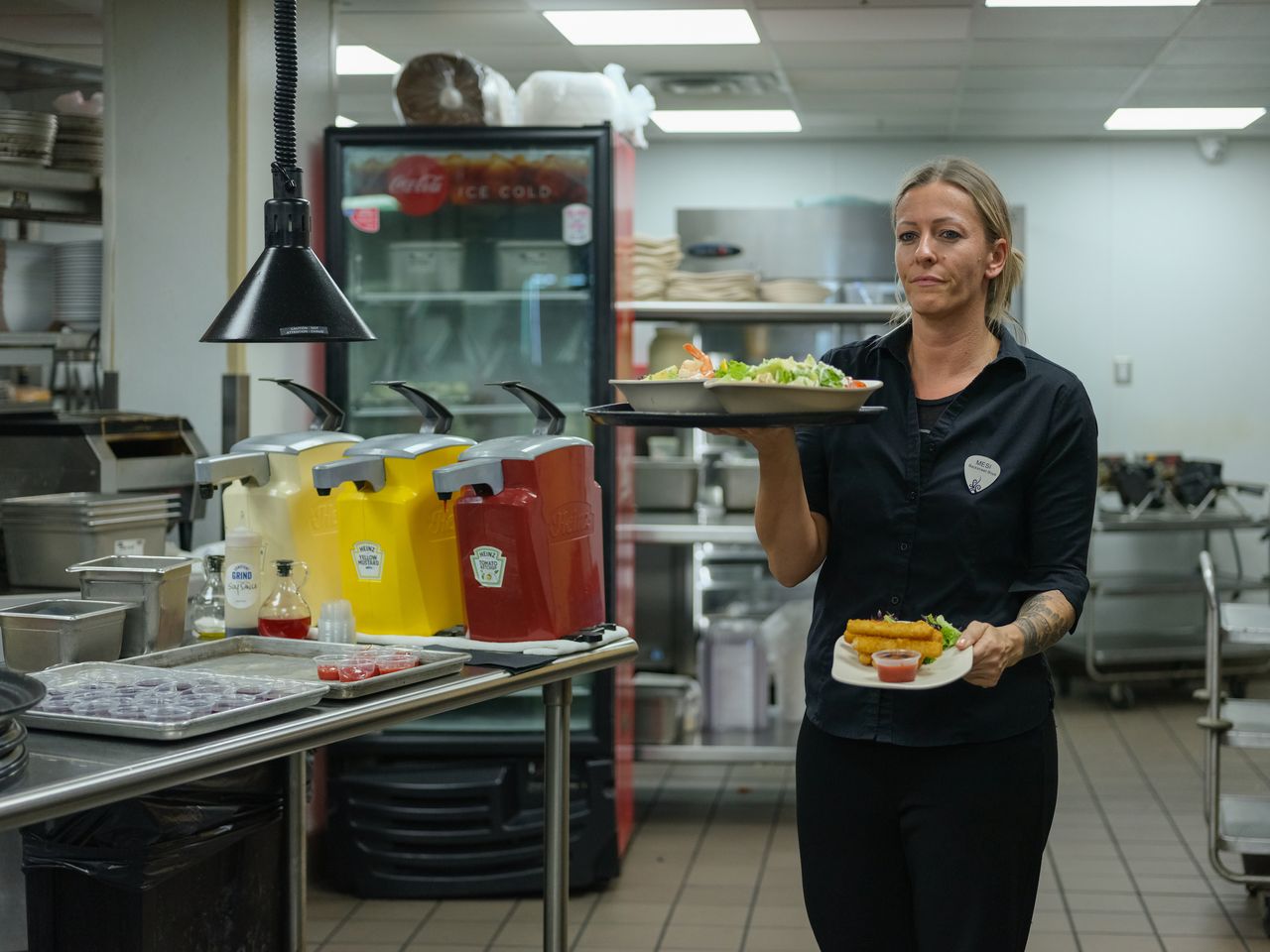 埃梅塞·施瓦霍費爾正將食物從廚房運往泳池邊,同時她還負責經營咖啡館。
