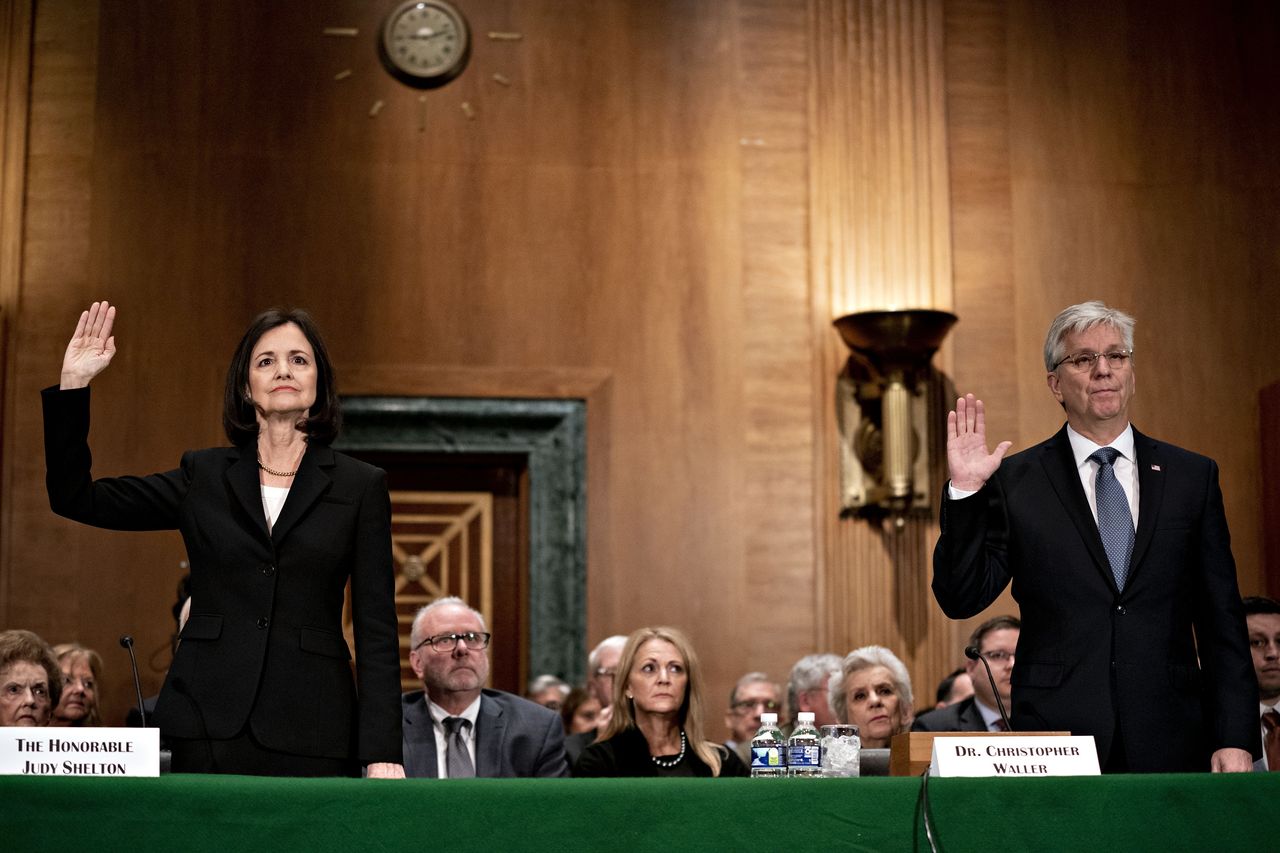 2020年,克里斯托弗·沃勒在華盛頓參議院銀行委員會確認聽證會上。圖片來源:Andrew Harrer/Bloomberg News2019年,特朗普對美聯儲降息速度不滿,卻難以讓參議院批准其親信進入美聯儲理事會。白宮顧問拉里·庫德洛向時任聖路易斯聯儲主席詹姆斯·布拉德尋求建議,後者曾反對加息並正推動降息。布拉德推薦了沃勒。